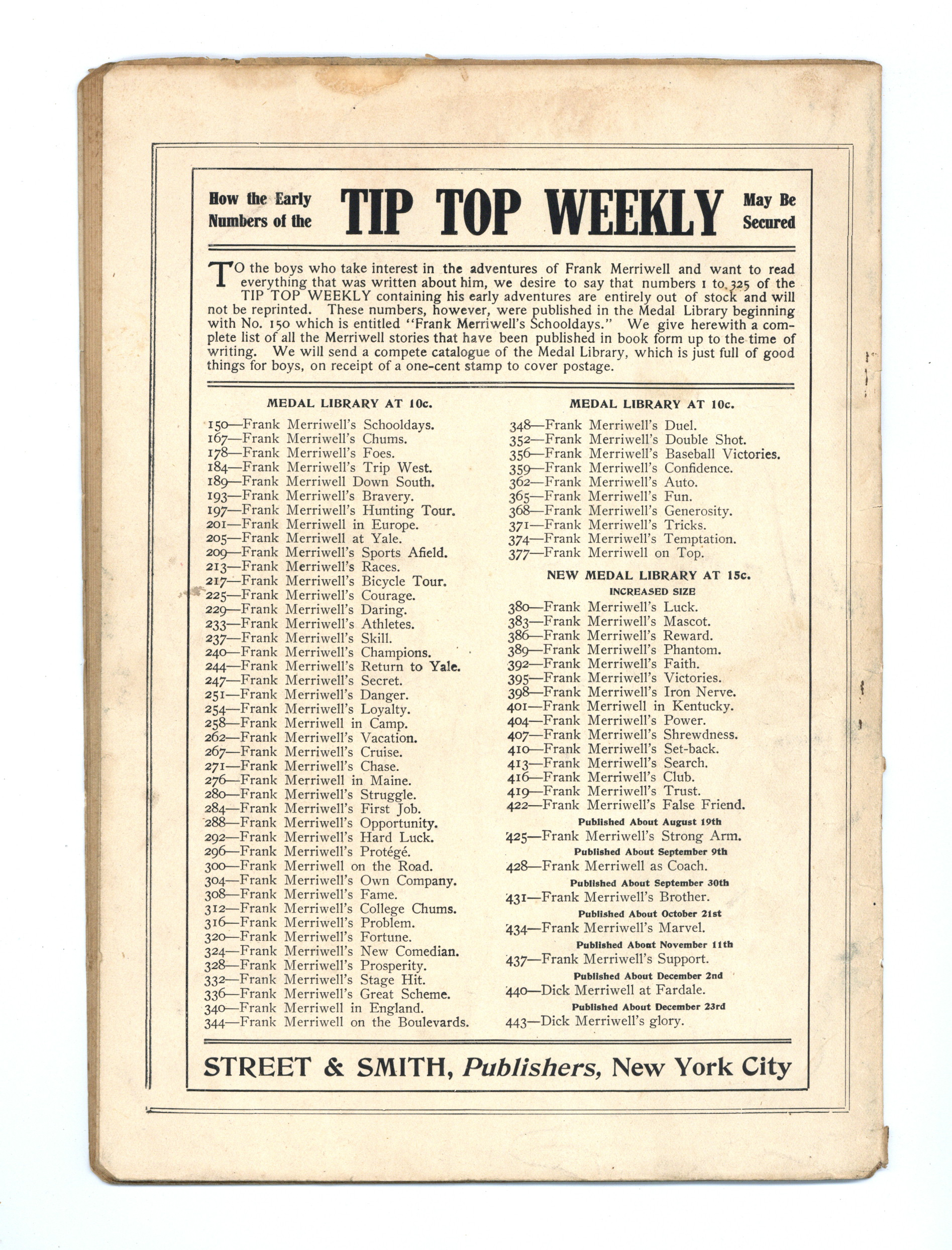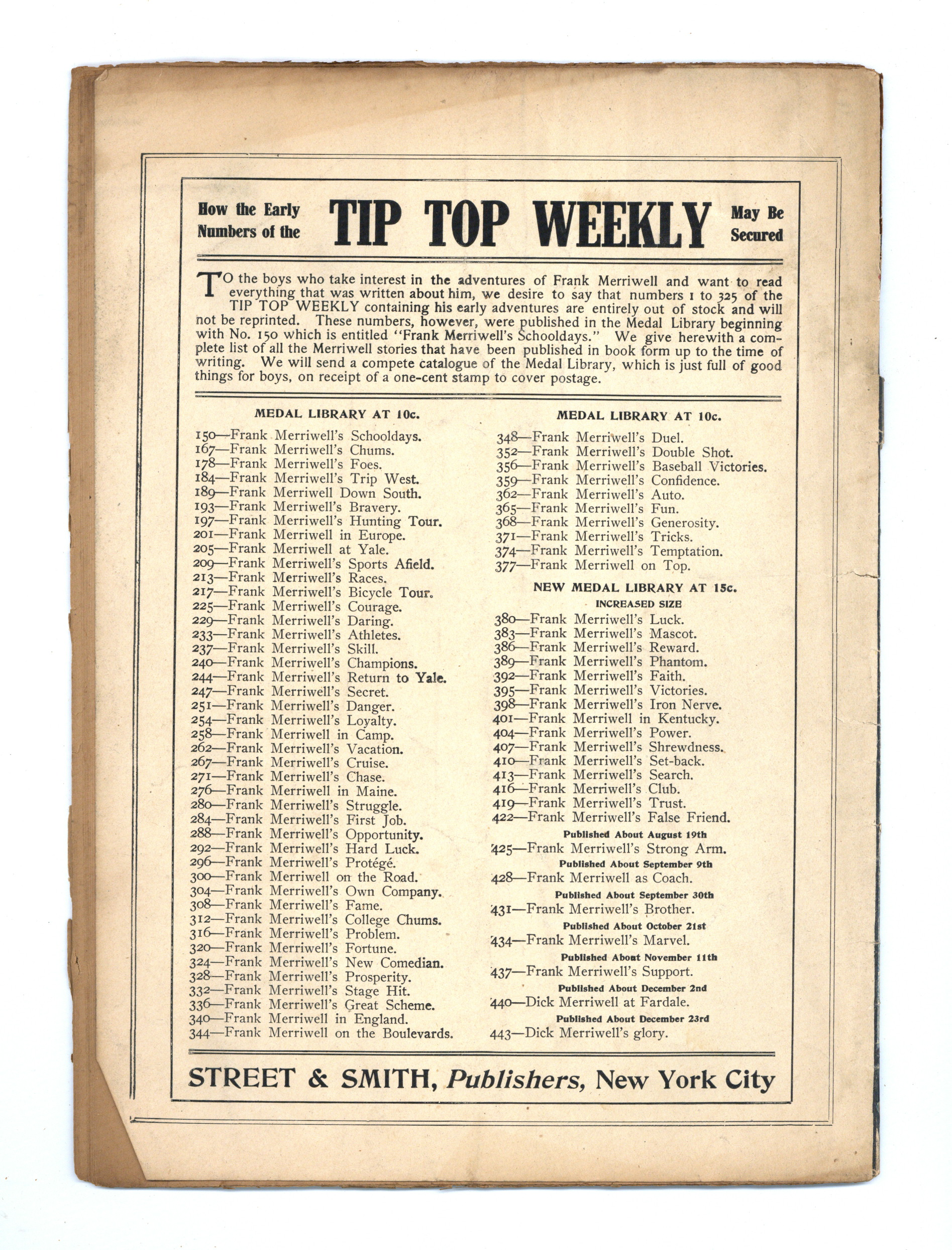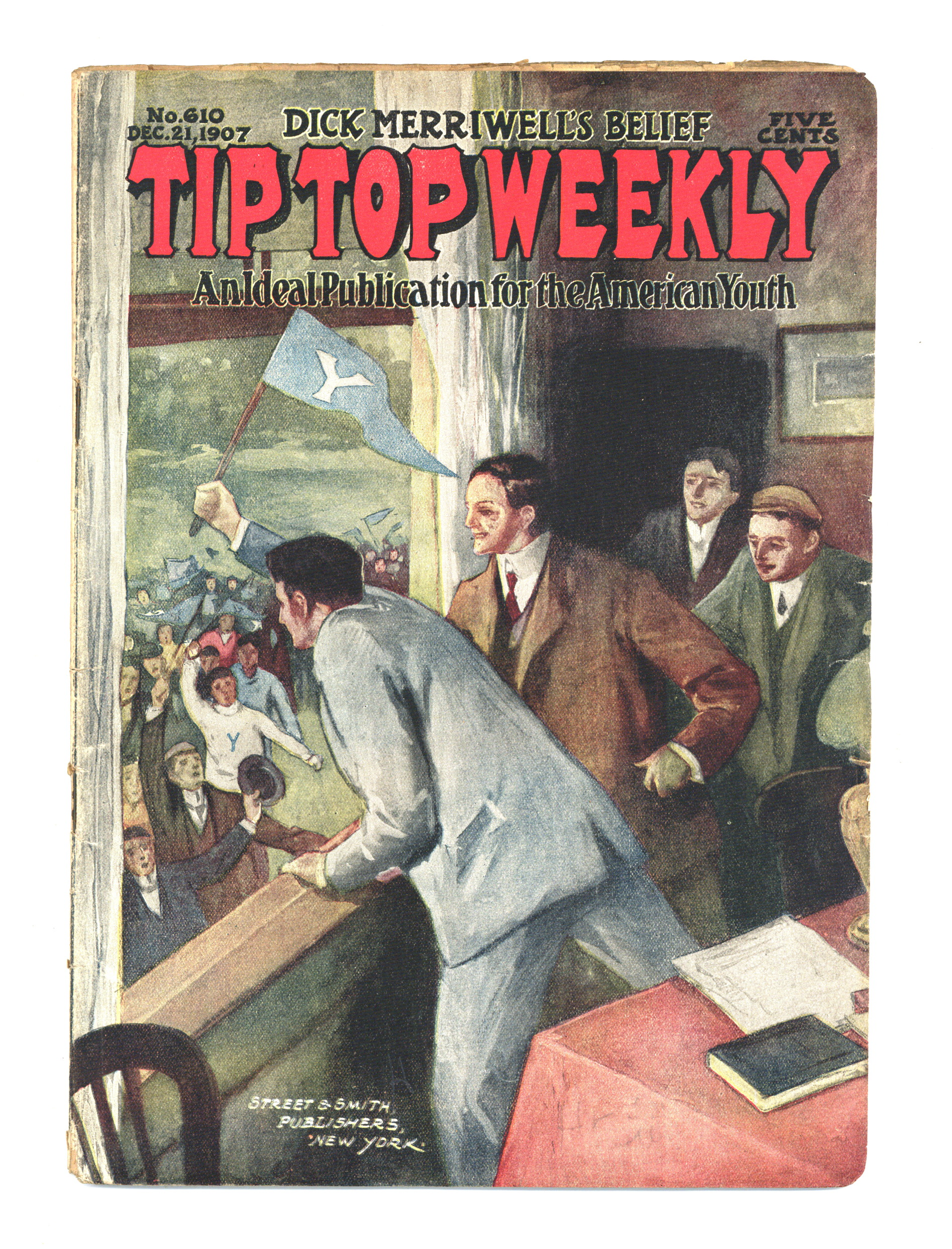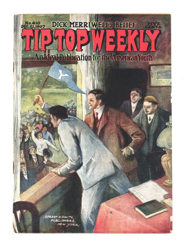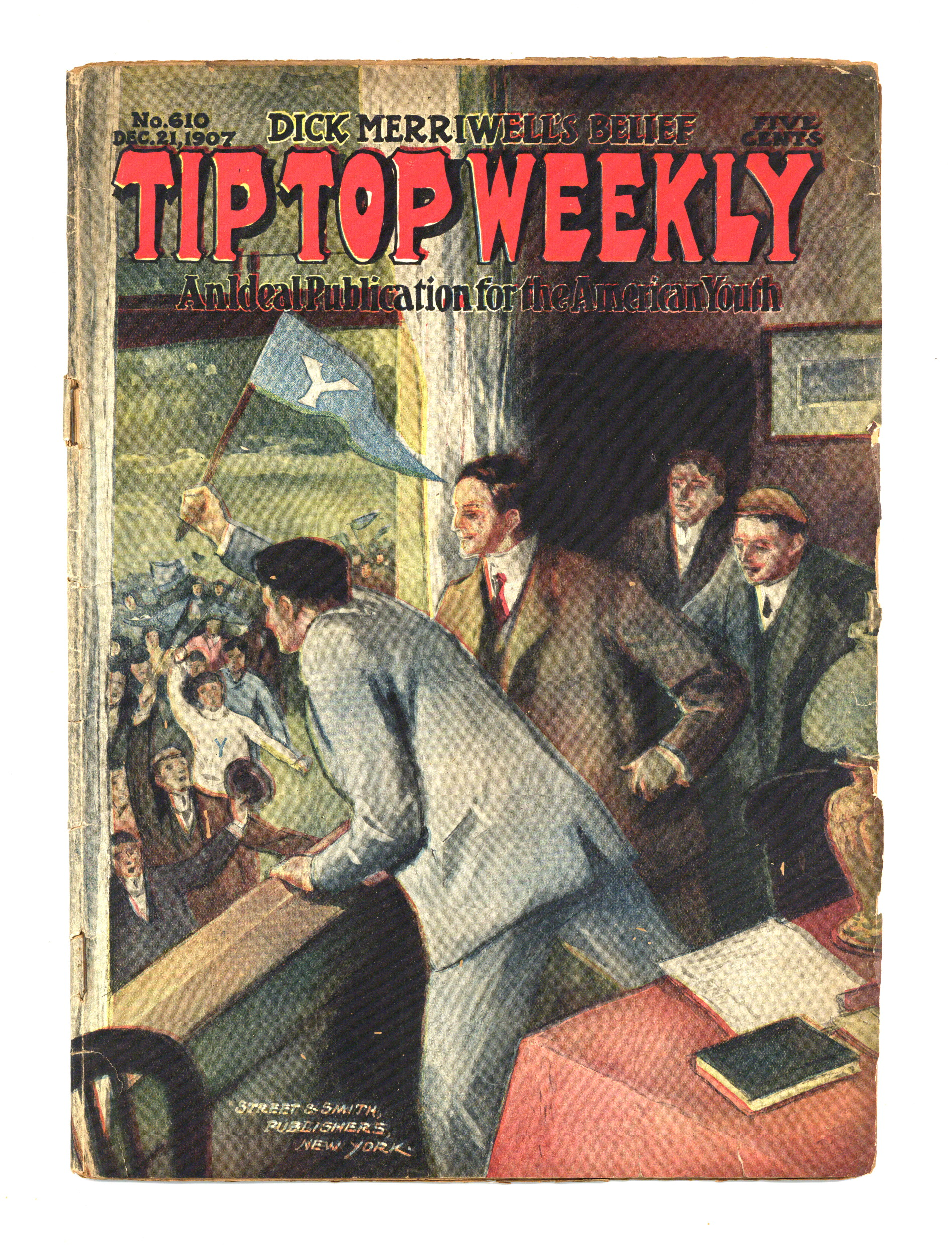 December 21, 1907. Written by Burt L. Standish (Gilbert Patten). Tip Top Weekly was promoted as "An Ideal Publication for American Youth," and was primarily devoted to the continuing adventures of student Frank Merriwell, who started at a fictional New England academy and then went to Yale, eventually becoming an international adventurer. Newsprint. 8.25-in. x 10.5-in. 34 pages, Text. Cover price $0.05.