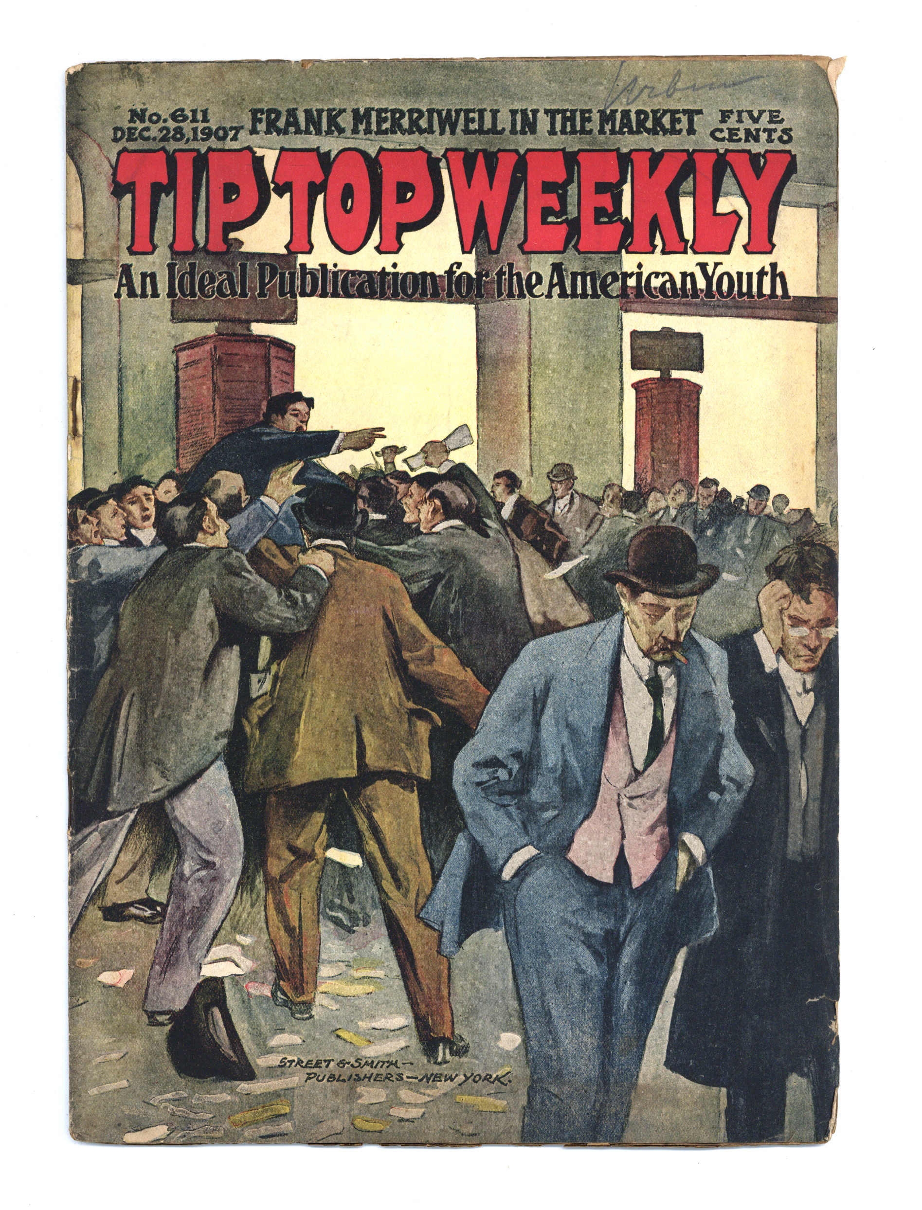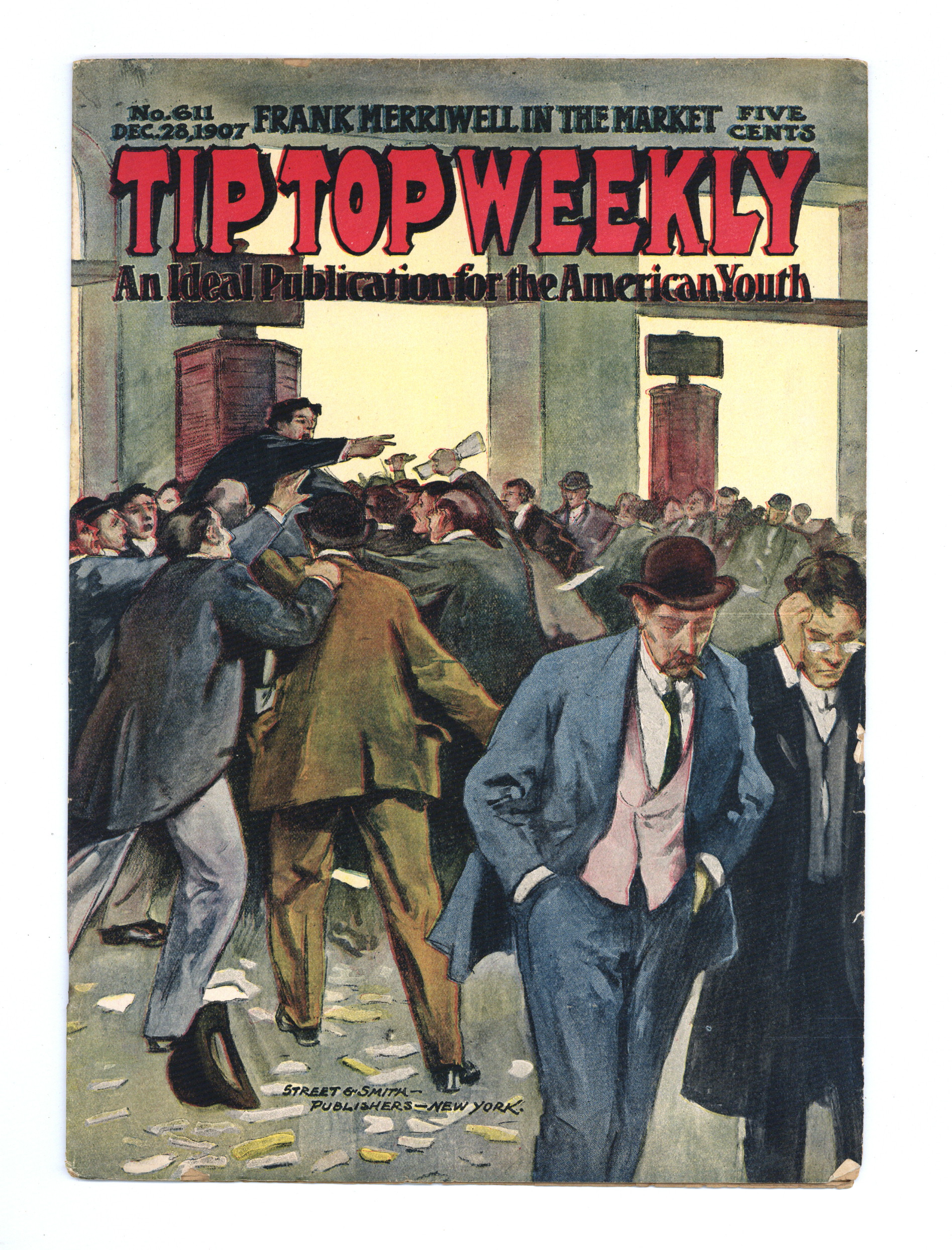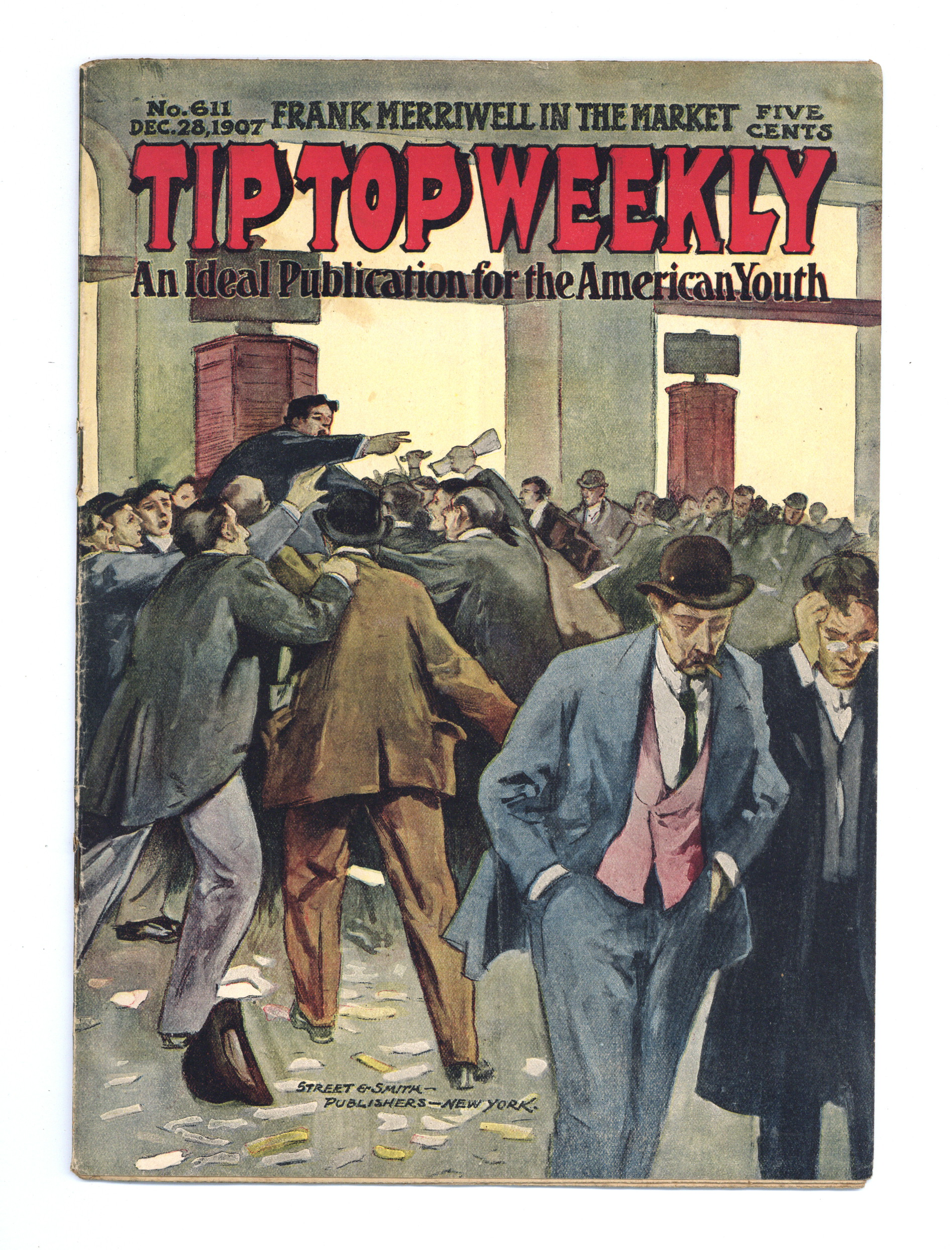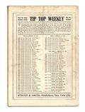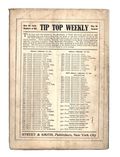 December 28, 1907. Written by Burt L. Standish (Gilbert Patten). Tip Top Weekly was promoted as "An Ideal Publication for American Youth," and was primarily devoted to the continuing adventures of student Frank Merriwell, who started at a fictional New England academy and then went to Yale, eventually becoming an international adventurer. Newsprint. 8.25-in. x 10.5-in. 36 pages, Text. Cover price $0.05.