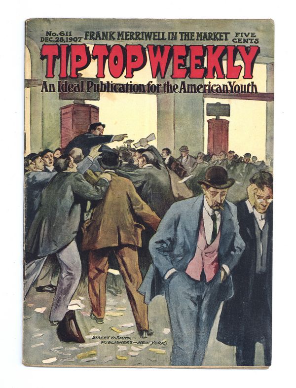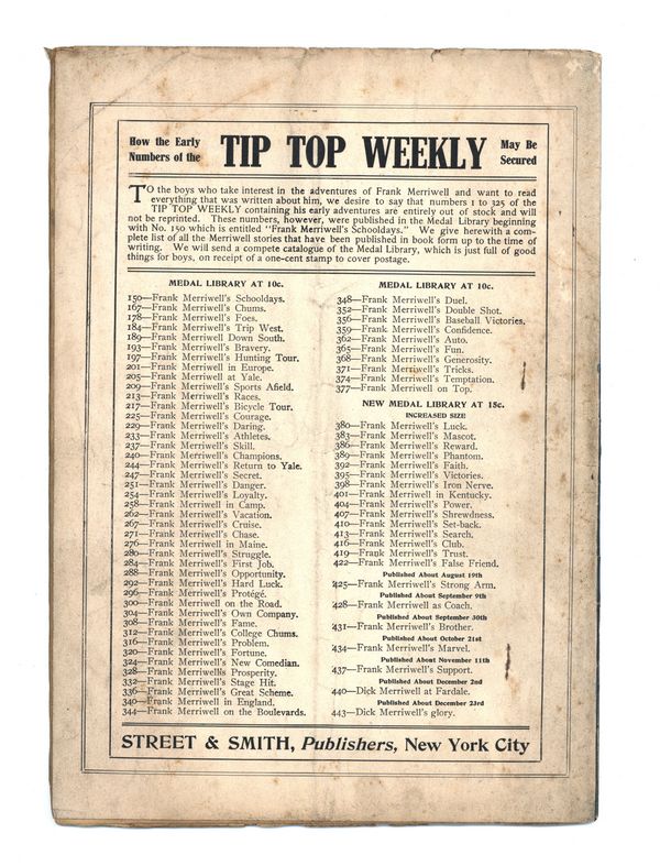 Published Dec 1907 by Street & Smith.$15.00December 28, 1907. Written by Burt L. Standish (Gilbert Patten). Tip Top Weekly was promoted as "An Ideal Publication for American Youth," and was primarily devoted to the continuing adventures of student Frank Merriwell, who started at a fictional New England academy and then went to Yale, eventually becoming an international adventurer. Newsprint. 8.25-in. x 10.5-in. 36 pages, Text. Cover price $0.05.