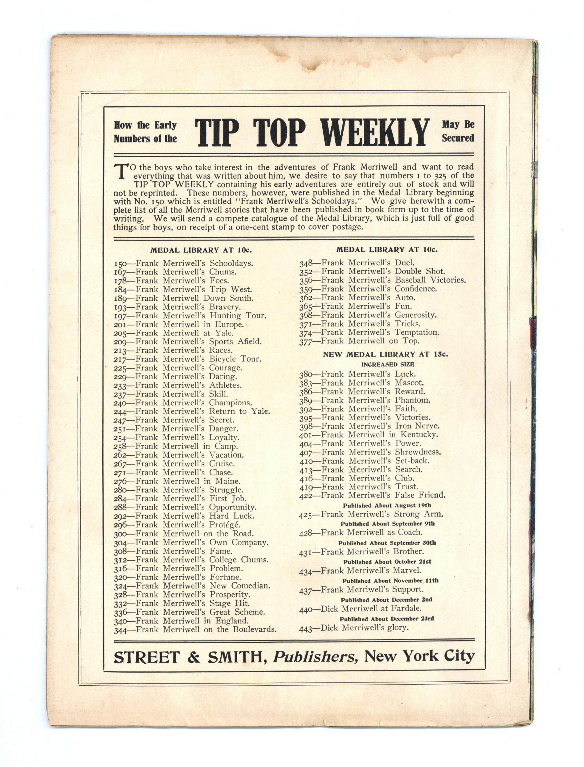Published Dec 1907 by Street & Smith.$10.00December 28, 1907. Written by Burt L. Standish (Gilbert Patten). Tip Top Weekly was promoted as "An Ideal Publication for American Youth," and was primarily devoted to the continuing adventures of student Frank Merriwell, who started at a fictional New England academy and then went to Yale, eventually becoming an international adventurer. Newsprint. 8.25-in. x 10.5-in. 36 pages, Text. Cover price $0.05.