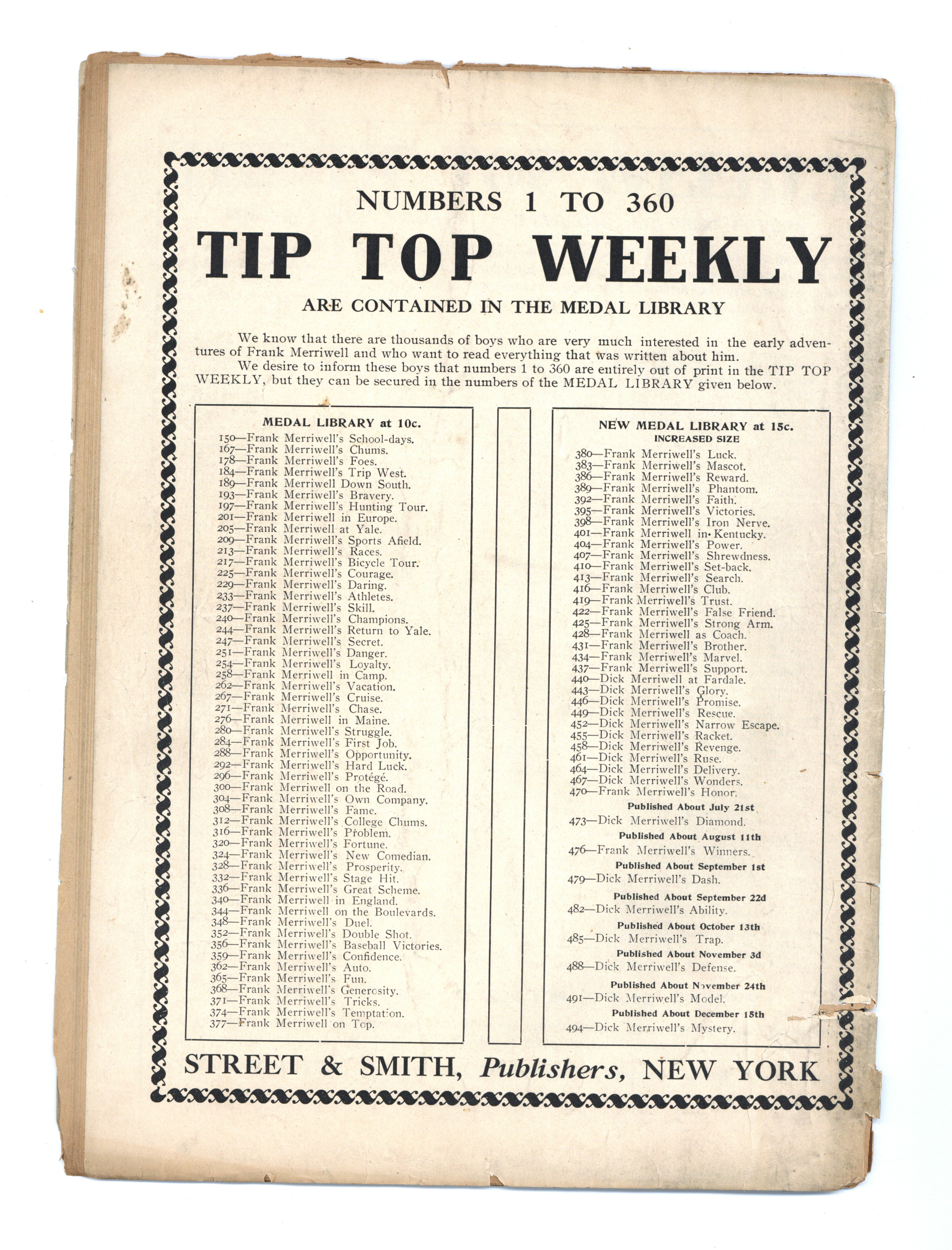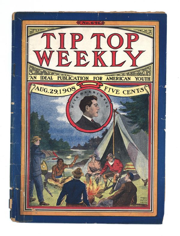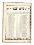 August 29, 1908. Written by Burt L. Standish (Gilbert Patten). Tip Top Weekly was promoted as "An Ideal Publication for American Youth," and was primarily devoted to the continuing adventures of student Frank Merriwell, who started at a fictional New England academy and then went to Yale, eventually becoming an international adventurer. Newsprint. 8.25-in. x 10.5-in. 34 pages, Text. Cover price $0.05.
