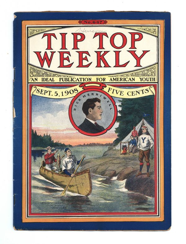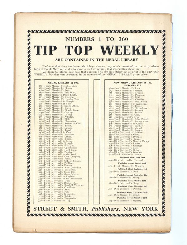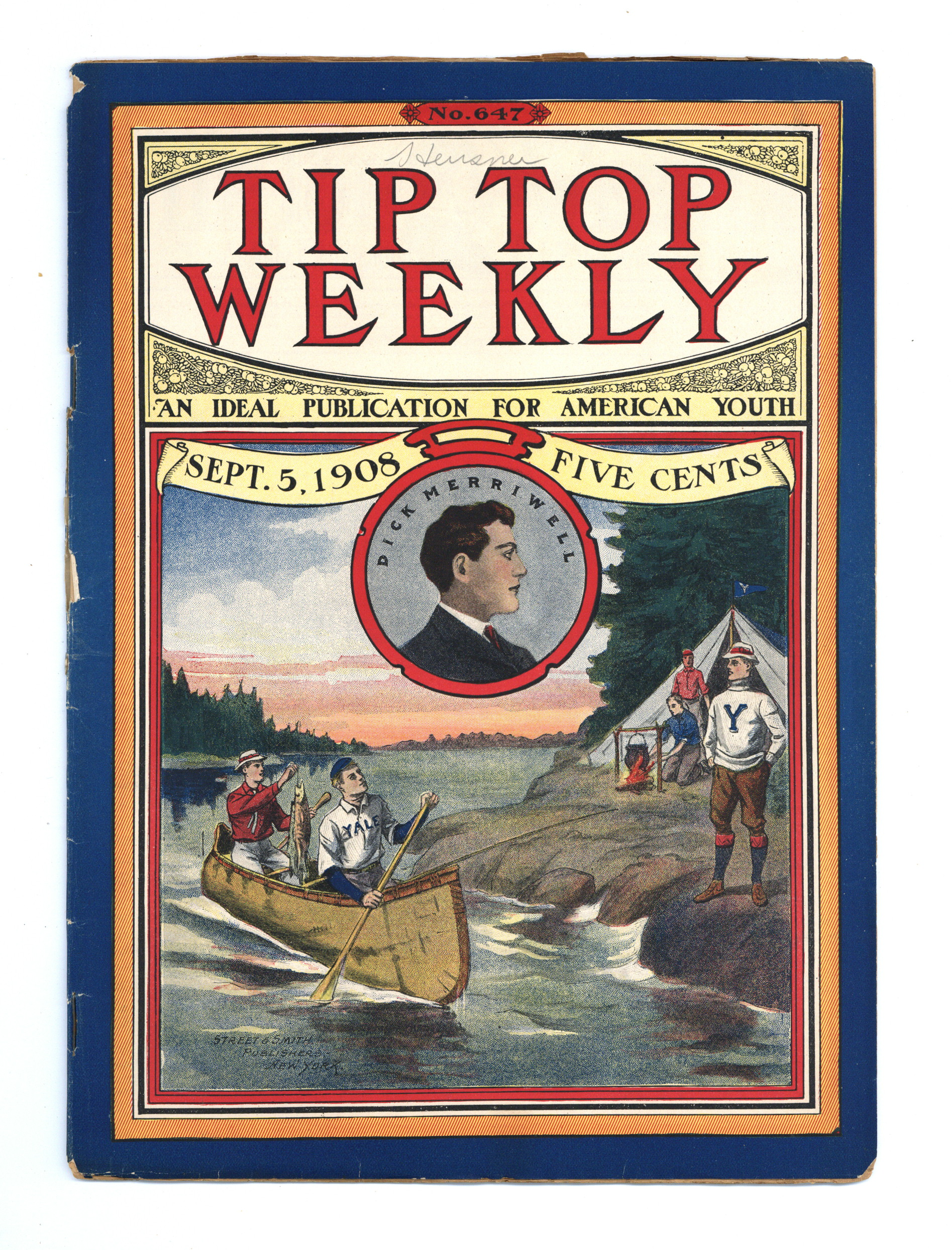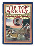 September 5, 1908. Written by Burt L. Standish (Gilbert Patten). Tip Top Weekly was promoted as "An Ideal Publication for American Youth," and was primarily devoted to the continuing adventures of student Frank Merriwell, who started at a fictional New England academy and then went to Yale, eventually becoming an international adventurer. Newsprint. 8.25-in. x 10.5-in. 34 pages, Text. Cover price $0.05.