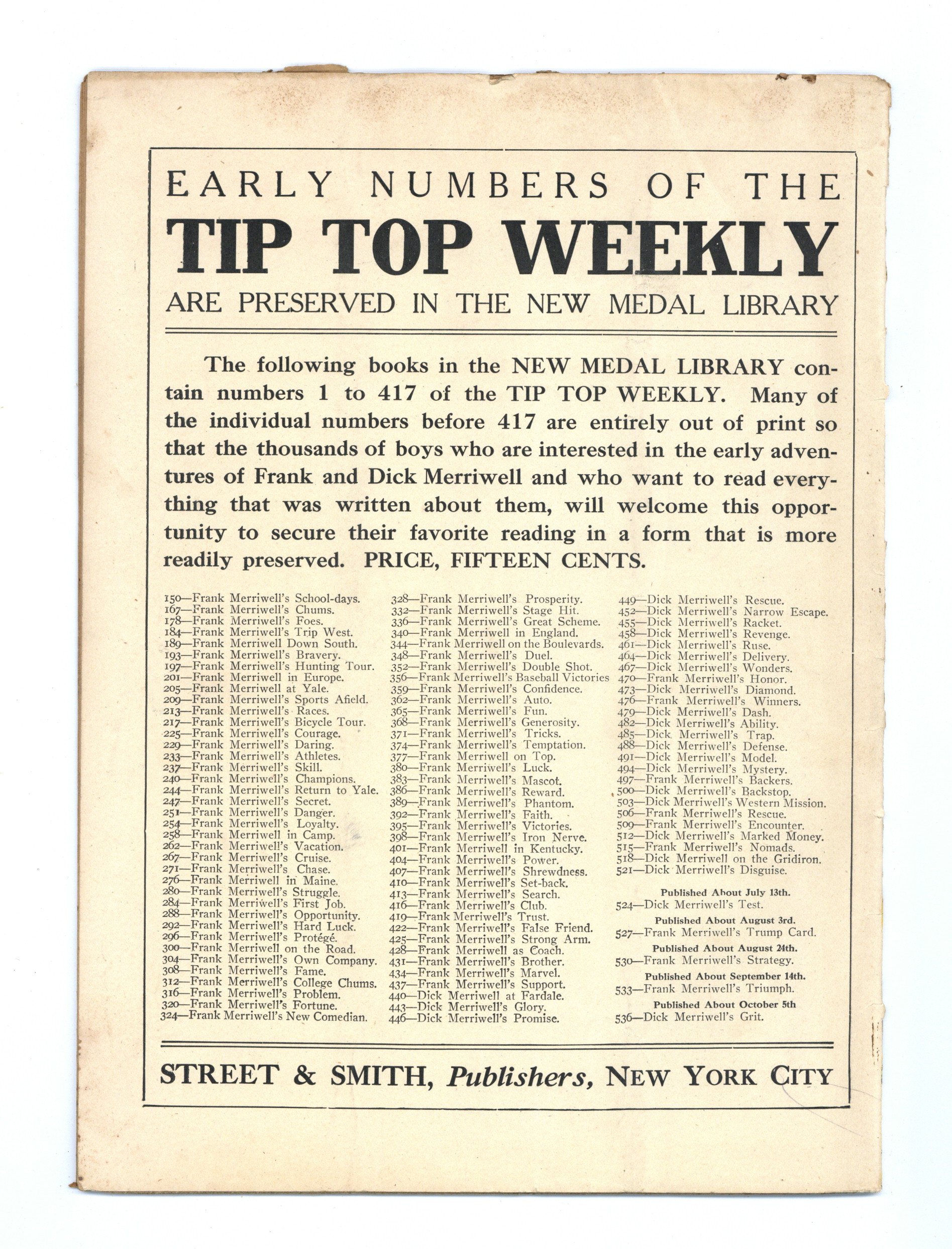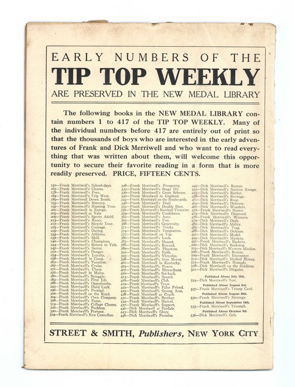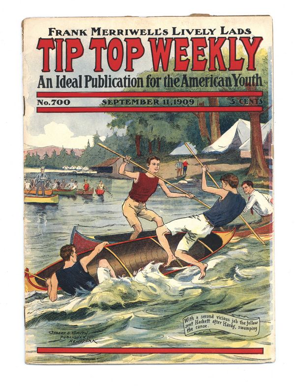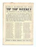 September 11, 1909. Written by Burt L. Standish (Gilbert Patten). Tip Top Weekly was promoted as "An Ideal Publication for American Youth," and was primarily devoted to the continuing adventures of student Frank Merriwell, who started at a fictional New England academy and then went to Yale, eventually becoming an international adventurer. Newsprint. 8.25-in. x 10.5-in. 34 pages, Text. Cover price $0.05.