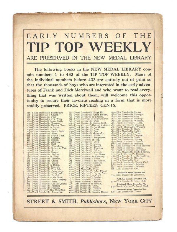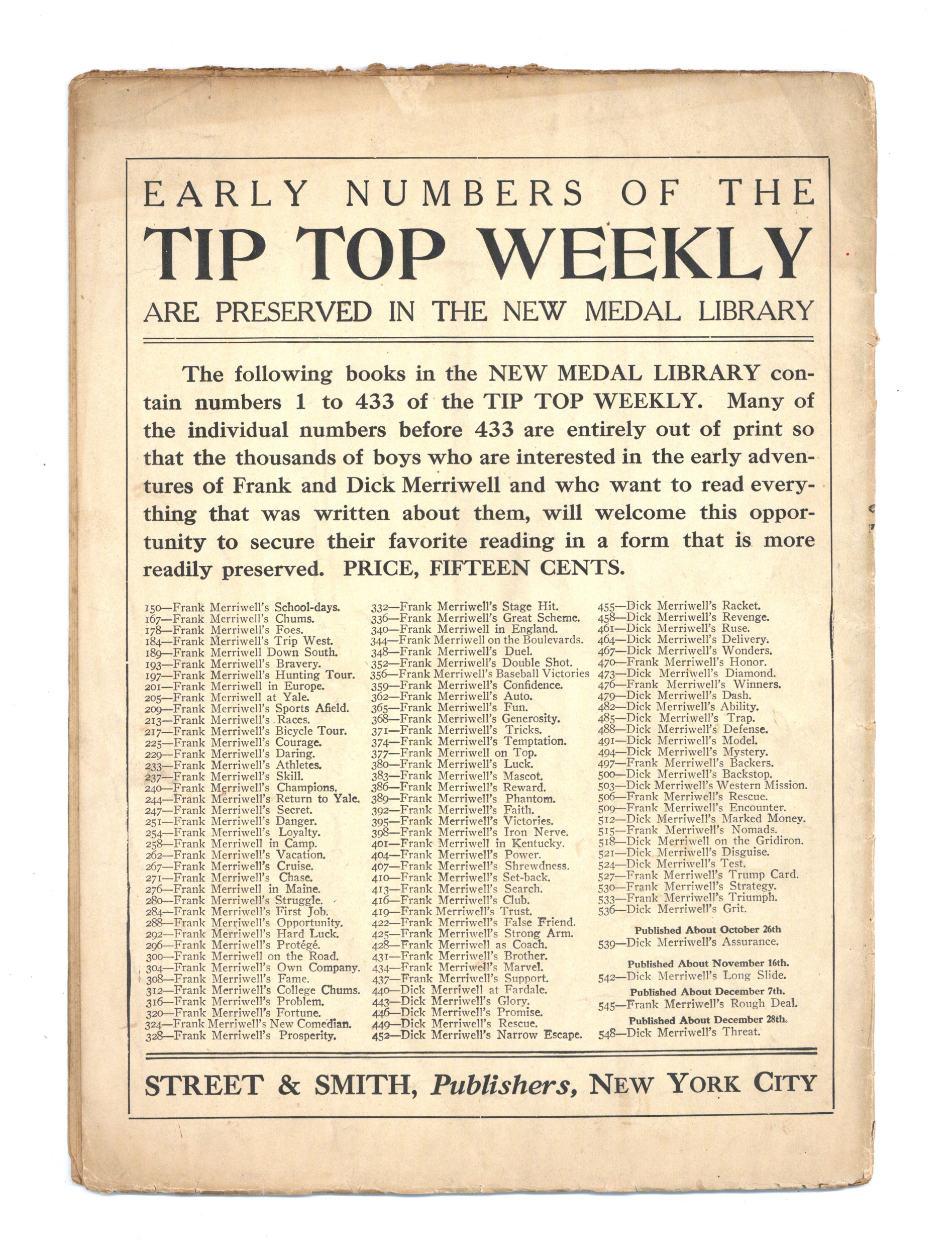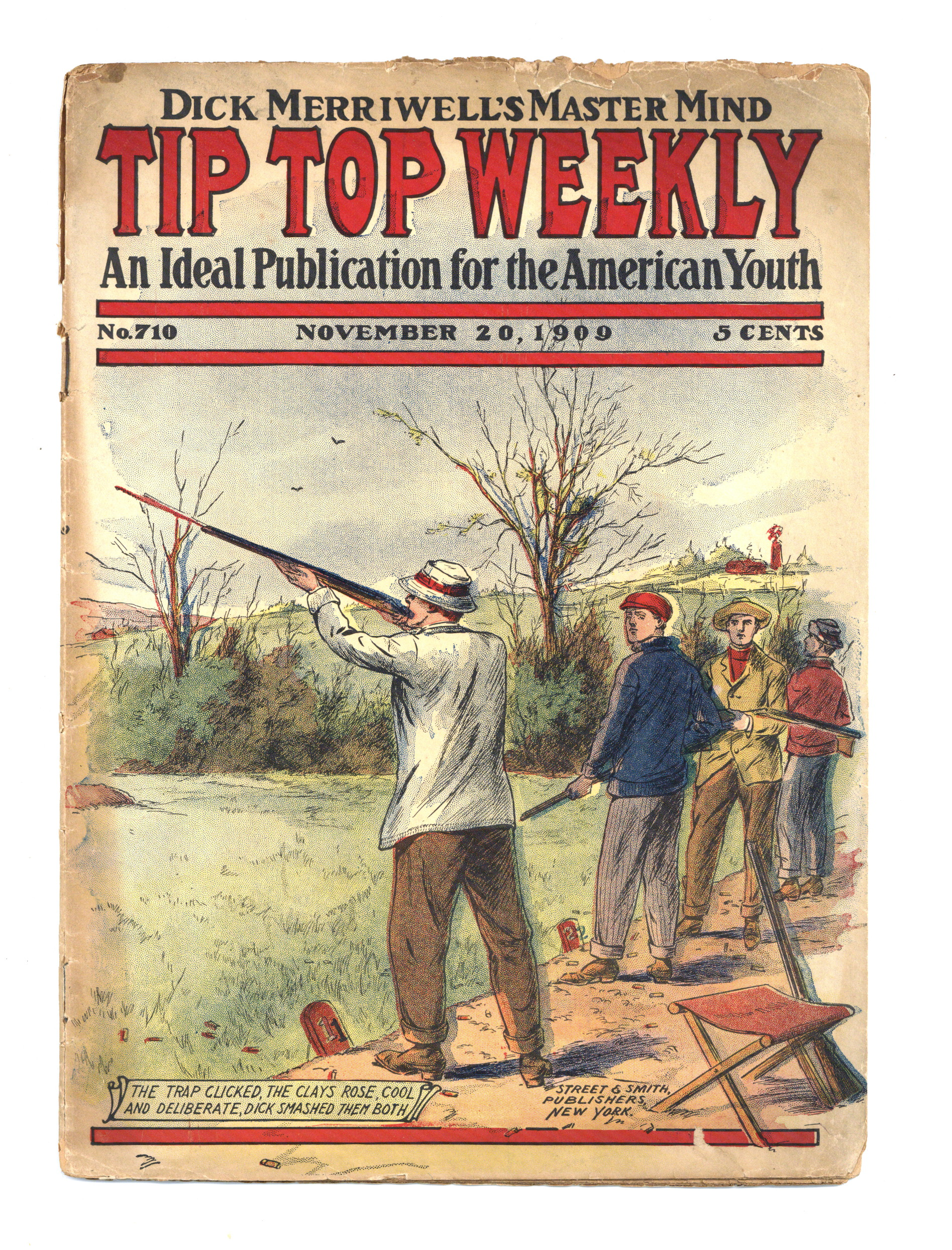 November 20, 1909. Written by Burt L. Standish (Gilbert Patten). Tip Top Weekly was promoted as "An Ideal Publication for American Youth," and was primarily devoted to the continuing adventures of student Frank Merriwell, who started at a fictional New England academy and then went to Yale, eventually becoming an international adventurer. Newsprint. 8.25-in. x 10.5-in. 34 pages, Text. Cover price $0.05.