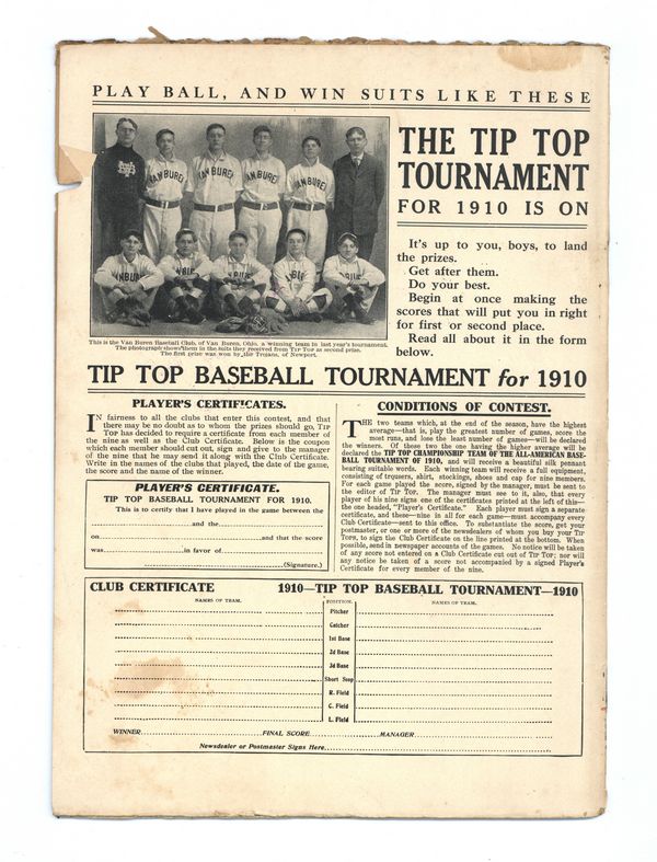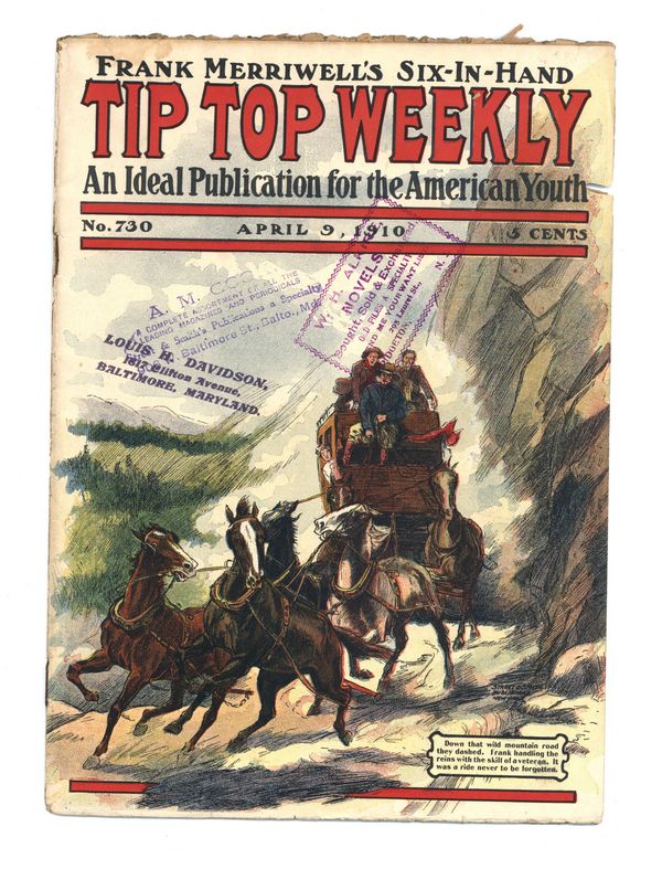 April 9, 1910. Written by Burt L. Standish (Gilbert Patten). Tip Top Weekly was promoted as "An Ideal Publication for American Youth," and was primarily devoted to the continuing adventures of student Frank Merriwell, who started at a fictional New England academy and then went to Yale, eventually becoming an international adventurer. Newsprint. 8.25-in. x 10.5-in. 34 pages, Text. Cover price $0.05.