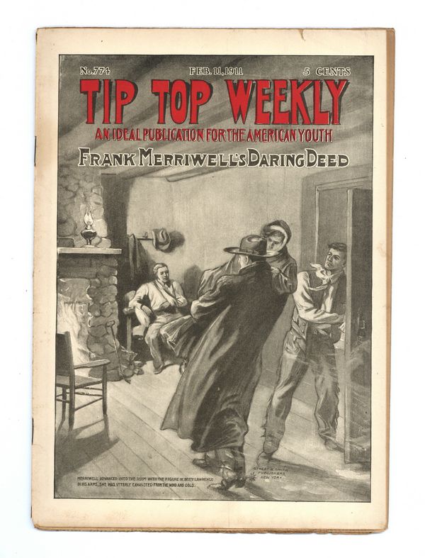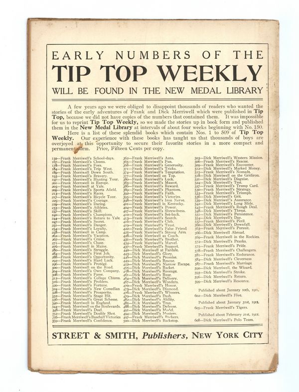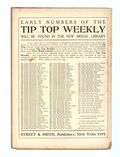 February 11, 1911. Written by Burt L. Standish (Gilbert Patten). Tip Top Weekly was promoted as "An Ideal Publication for American Youth," and was primarily devoted to the continuing adventures of student Frank Merriwell, who started at a fictional New England academy and then went to Yale, eventually becoming an international adventurer. Newsprint. 8.25-in. x 10.5-in. 34 pages, Text. Cover price $0.05.