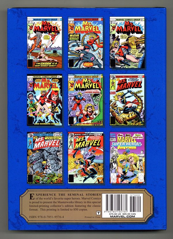 Volume 234 - 1st printing. "Ms. Marvel: Book 2!" Collects Ms. Marvel (1977-1979 1st Series) #15-23, Avengers (1963-1996 1st Series) #200, Avengers (1963-1996 1st Series) Annual #10 and material from Marvel Super Heroes (1990-1993 2nd Series) #10-11, Avengers (1963-1996 1st Series) #197-199 and Marvel Fanfare (1982-1992 1st Series) #24. Cover by George Perez. Chris Claremont weaves complex plots and compelling characterization in our second Ms. Marvel Masterworks, concluding Carol Danvers' original adventures! The highlights are many: Ms. Marvel meets the Avengers! Mystique makes her first appearance! A battle with Ronan the Accuser brings Ms. Marvel and Captain Marvel together, and leads to an all-new look for our heroine! Encounters with underground lizard-men, Deathbird, the Guardians of the Galaxy and Sabretooth set the stage for a controversial Avengers saga and a life-altering battle with Mystique and Rogue. And the story reaches its epic conclusion in a Marvel milestone featuring Ms. Marvel, the X-Men and the Avengers! Hardcover, 328 pages, full color. NOTE: Limited to 850 copies. Cover price $75.00.