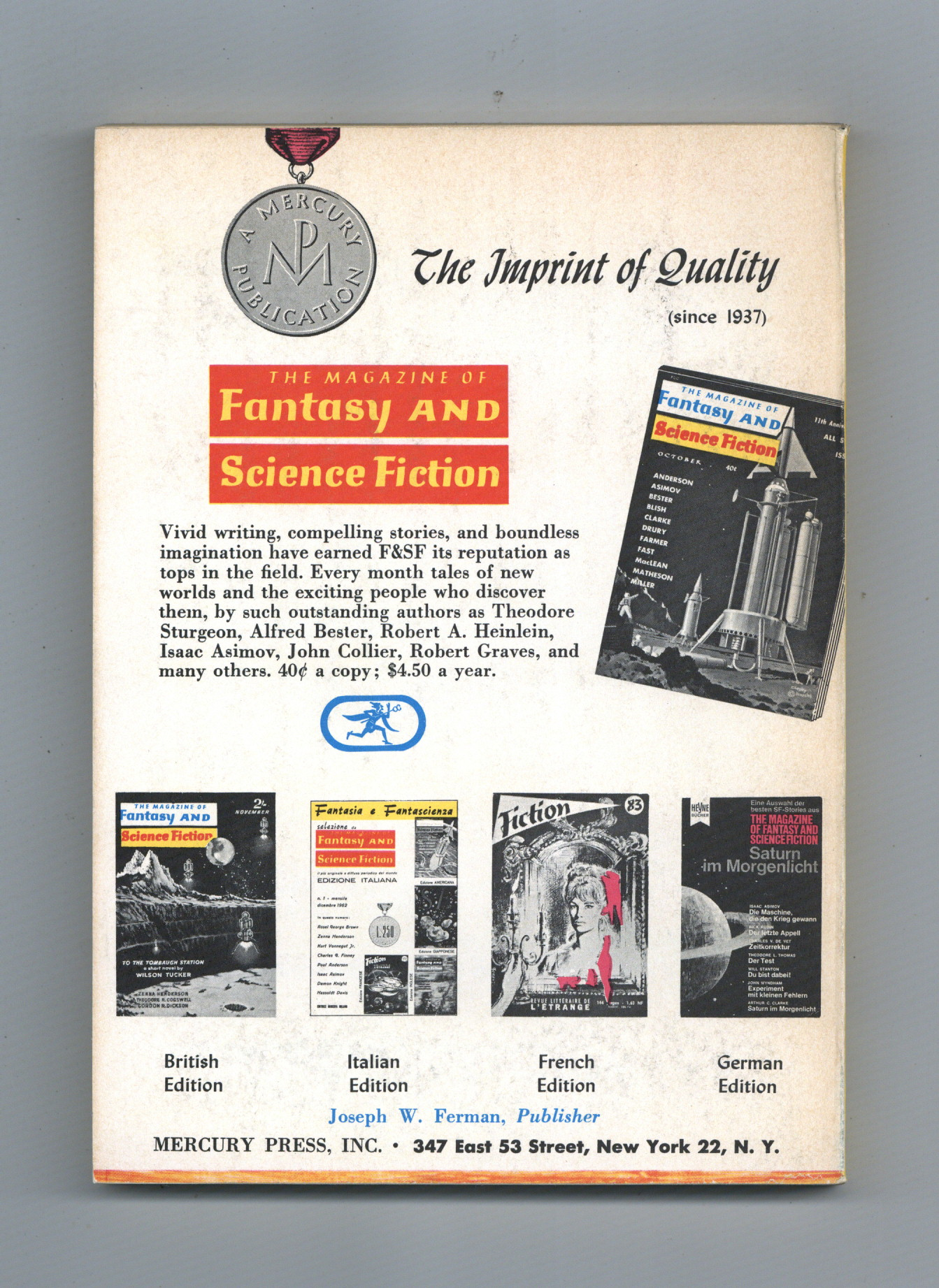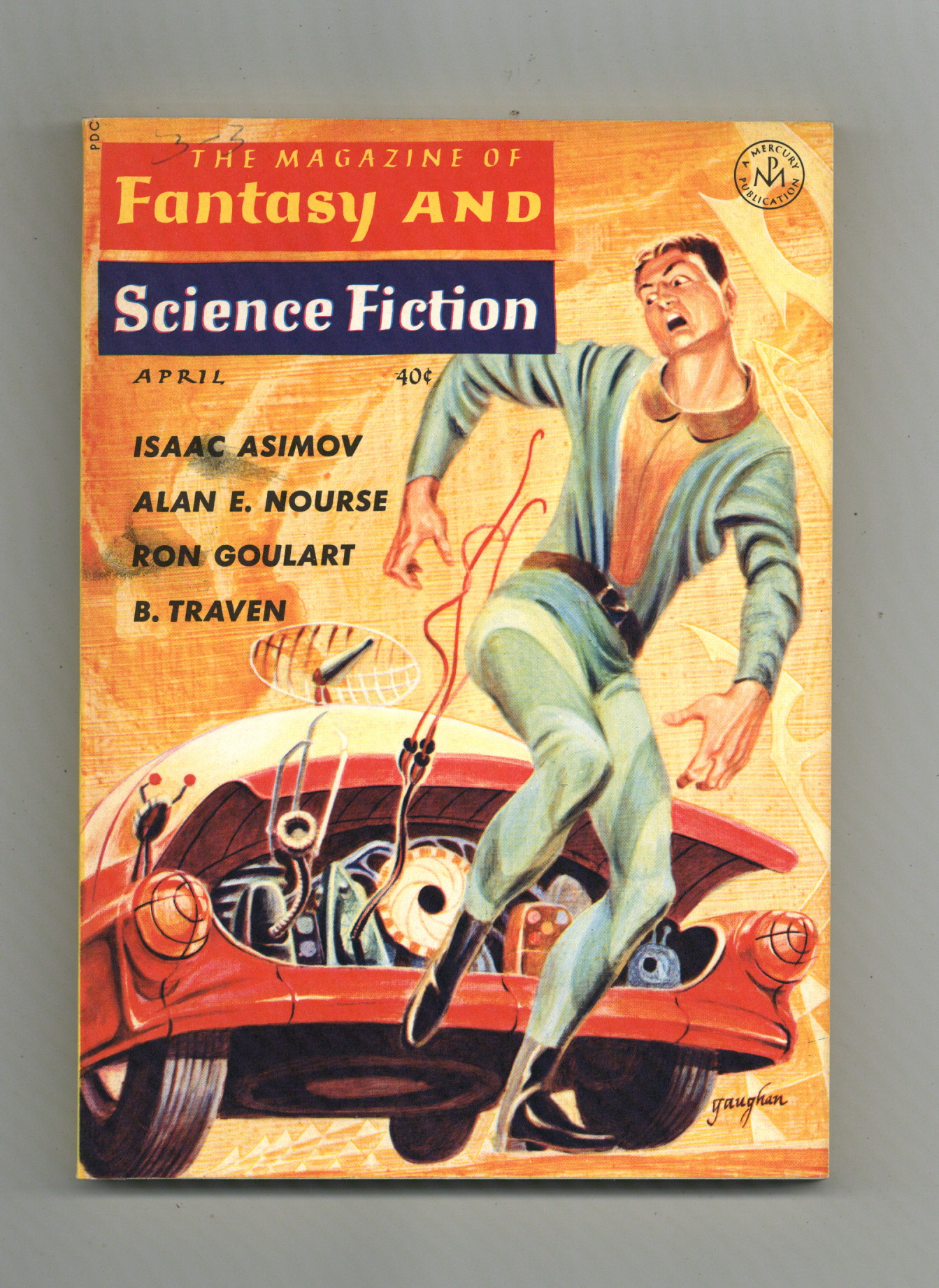 Published Apr 1964 by Mercury Publications.$9.00Volume 26 , Issue 4 - April 1964. Science fiction stories by Isaac Asimov, Alan E. Nourse, Ron Goulart, and B. Traven. Cover by Jack Gaughan/ Softcover, 5 1/2-in. x 7 1/2-in.,130 pages, B&W. Cover price $0.40.