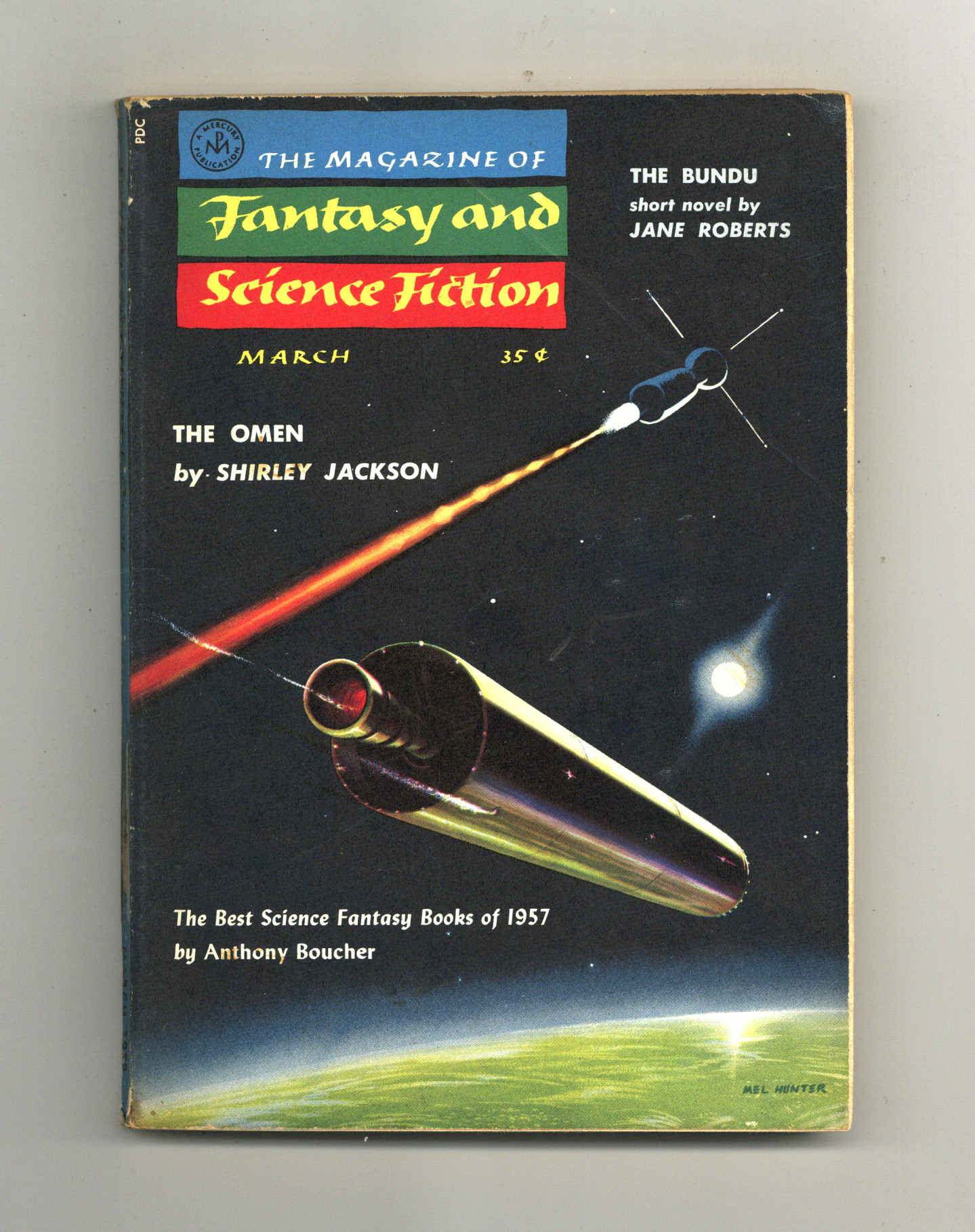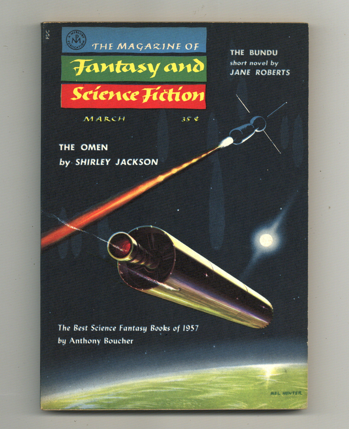 Published Mar 1958 by Mercury Publications.$36.00Volume 14, Issue 3 - March 1958. Cover by Mel Hunter. "The Omen" by Shirley Jackson, plus more fantasy and science fiction stories by Jane Roberts, Mack Reynolds, Edgar Allen Poe, Richard Wilson, Charles E. Fritch, Poul Anderson, and Robert Bloch. Softcover, 5 1/2-in. x 7 1/2-in., 132 pages, B&W. Cover price $0.35.