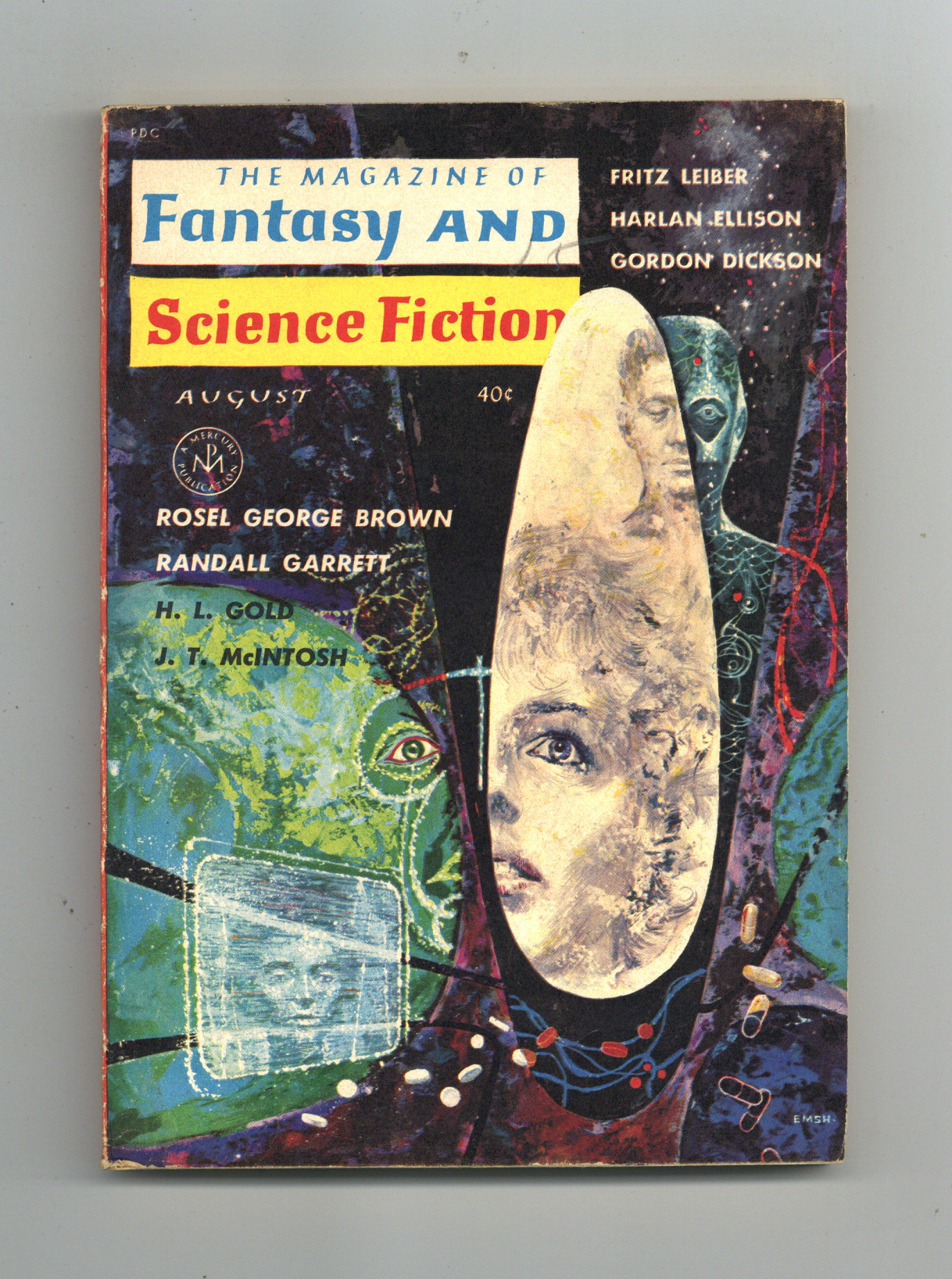 Published Aug 1962 by Mercury Publications.$5.10Volume 23, Issue 2 - August 1962. Cover by Ed Emsh. Fantasy and Science Fiction Stories by Rosel George Brown, Randall Garrett, H.L. Gold, J.T. McIntosh, Fritz Lieber, Harlan Ellison, and Gordon Dickson. 5 1/2-in. x 7 1/2-in., 130 pages, Text. Cover price $0.40.
