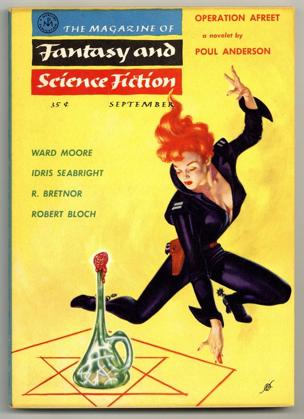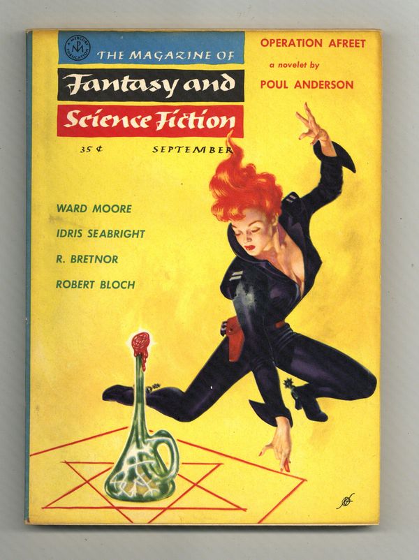 Published Sep 1956 by Mercury Publications.$3.60Volume 11, Issue 3 - September 1956. Cover by Kelly Freas. Fantasy and science fiction stories by Poul Anderson, Ward Moore, Idris Seabright, R. Bretnor, and Robert Bloch. Softcover, 5 1/2-in. x 7 1/2-in., 132 pages, B&W. NOTE: Year misprinted as 1955 on spine, indicia states 1956. Cover price $0.35.