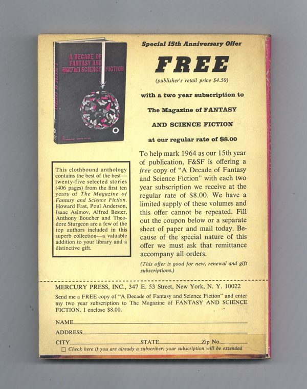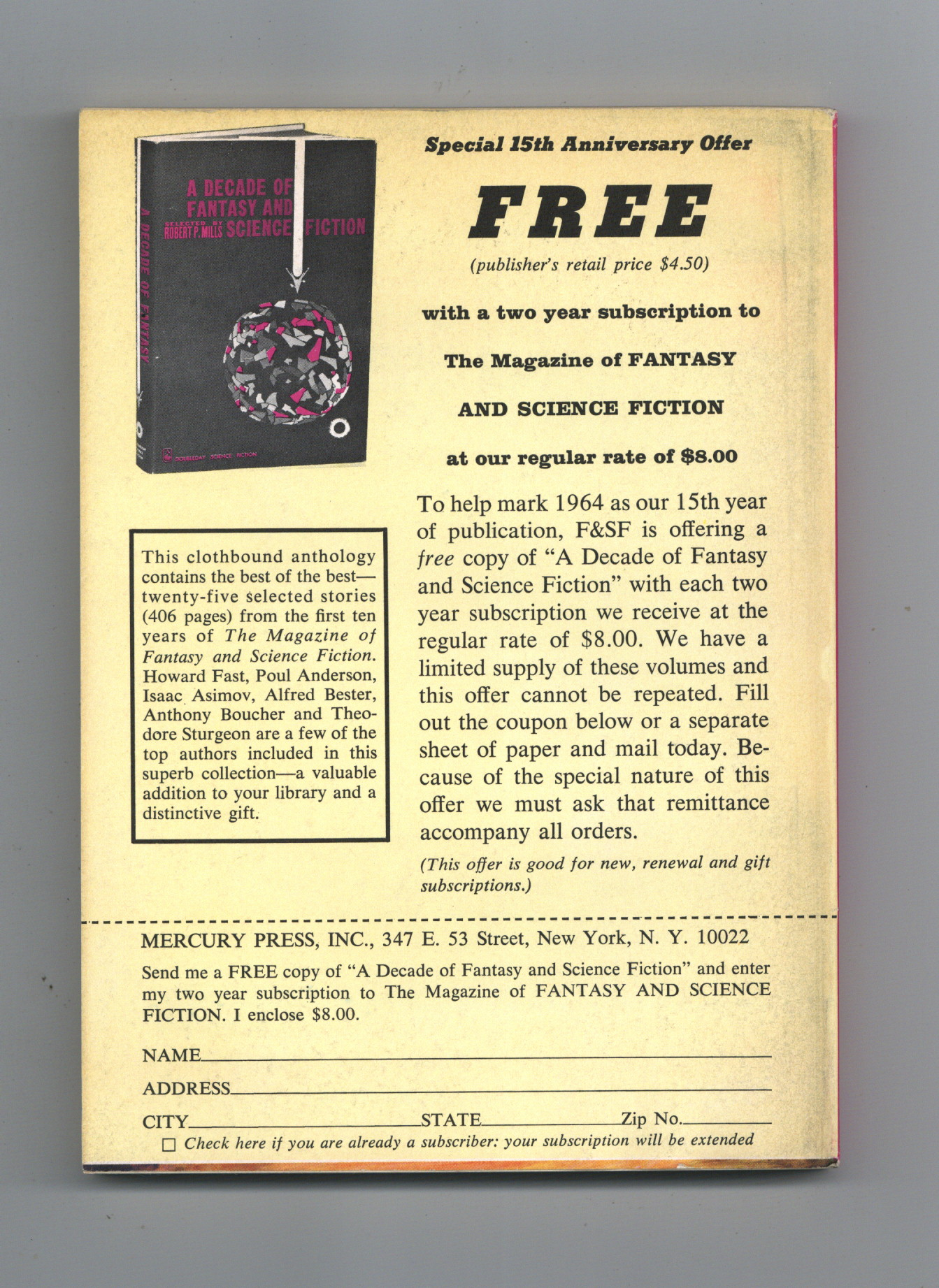 Published Feb 1964 by Mercury Publications.$6.70Volume 26, Issue 2 - February 1964. Cover by Jack Gaughn. Fantasy and Science fiction stories by Isaac Asimov, Ron Goulart, Wilson Tucker, and Evelyn E. Smith. Softcover, 5 1/2-in. x 7 1/2-in., 128 pages, B&W Cover price $0.40.