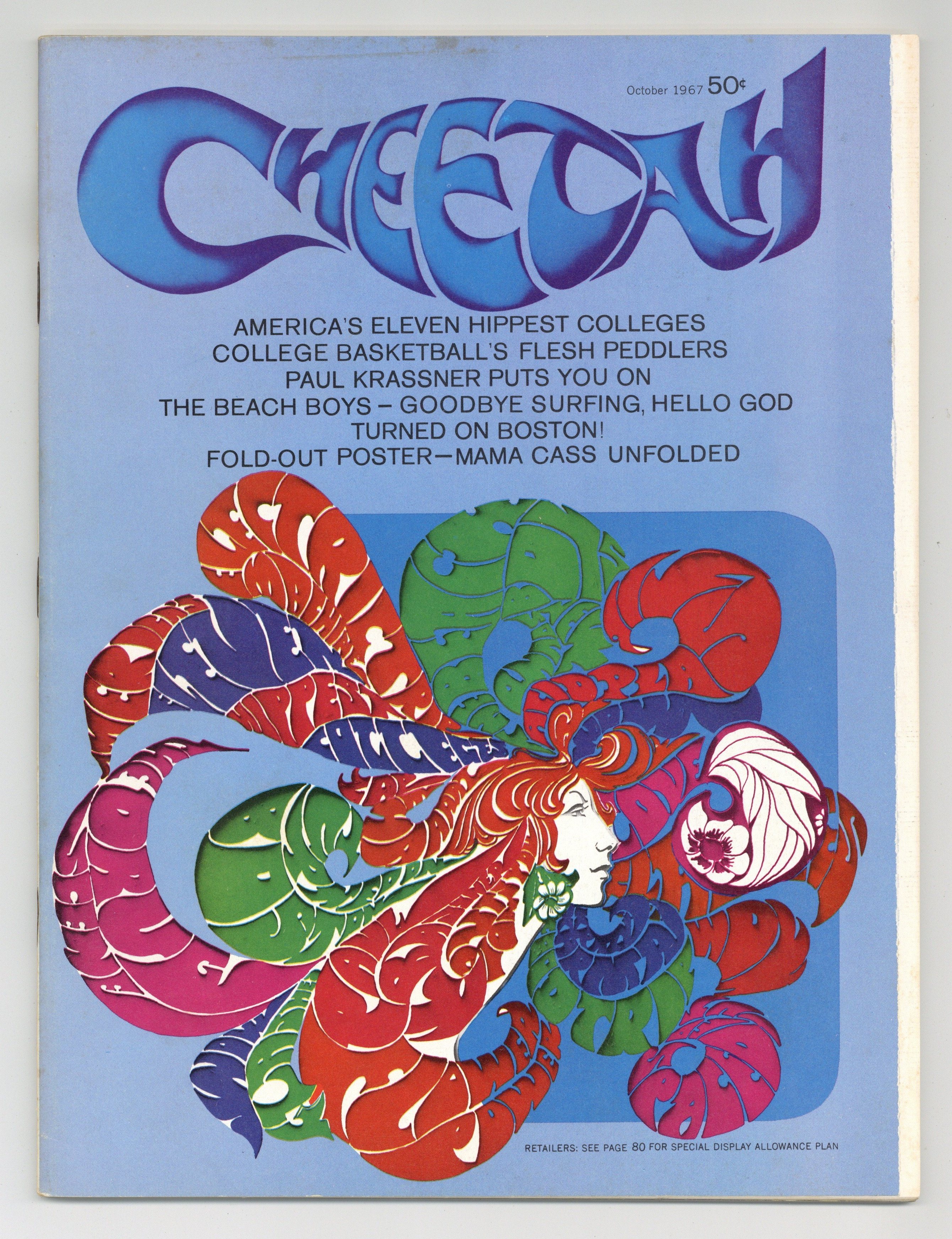 Debut issue. One of the early great rock magazines, known for probing into the emerging rock counterculture scene with some very serious journalism. Inside is the critically acclaimed interview by editor Jules Siegel with Brian Wilson about the Beach Boys' new sound, in which Brian states, "I'm writing a teen-age symphony to God". Classic psychadelic cover art and the inside of the cover folds out to reveal a tasteful semi-nude Mama Cass "Flower Power" poster, plus a report on the future of drugs and enlightenment, Hippest colleges, and lots more. 96 pages, BW,PC. Cover price $0.50.