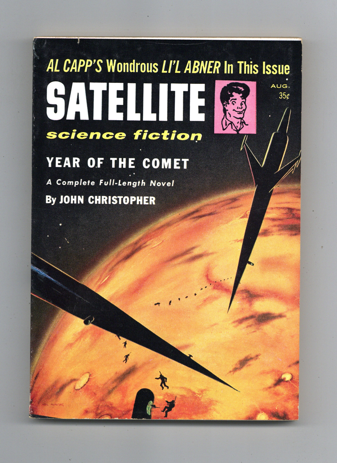 Aug 1957. Cover by Mel Hunter. Science fiction novel "Year of the Comet" by John Christopher, short stories "Cathartic" by William Sambrot and "Some Rain" by Dal Stivens, and comic strip Lil' Abner in "The Time Capsule" by Al Capp. Interior illustrations by Leo Morey. 5-3/8 in. x 7-5/8 in.; black and white; 132 pages. Cover price $0.35.
