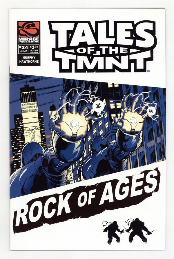 Published Jun 2006 by Mirage Studios.$16.75By Murphy and Hawthorne. "ROCK OF AGES" - Construction workers digging deep in the bedrock beneath New York awaken two long-buried robots! But when both the NYPD and the National Guard fail to stop the robots' rampage, it's left to Raphael and Michelangelo to try to save the city! Art by Mike (Hysteria, Umbra, The Ballad of Sleeping Beauty) Hawthorne! Plus, a bonus pin-up by Greg Titus! Cover price $3.25.