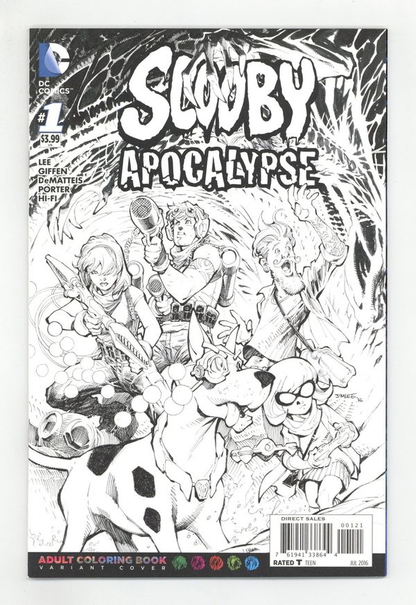 Coloring Book Variant. Written by Jim Lee, Keith Giffen and J.M. DeMatteis. Art by Howard Porter. Cover by Jim Lee. Those meddling kids-Fred, Daphne, Velma, Shaggy, and their dog, Scooby-Doo-get more ghost-debunking than they bargained for when faced with a fundamental change in their world. The apocalypse has happened. Old rules about logic no longer apply. The creatures of the night are among us, and the crew of the Magical Mystery Machine has to fight to survive-because in the apocalyptic badlands of the near-future, the horrors are real! This new monthly series takes Scooby and the gang to a whole new level and features character designs by comics superstar Jim Lee! 40 pages, full color, Rated T Cover price $3.99.