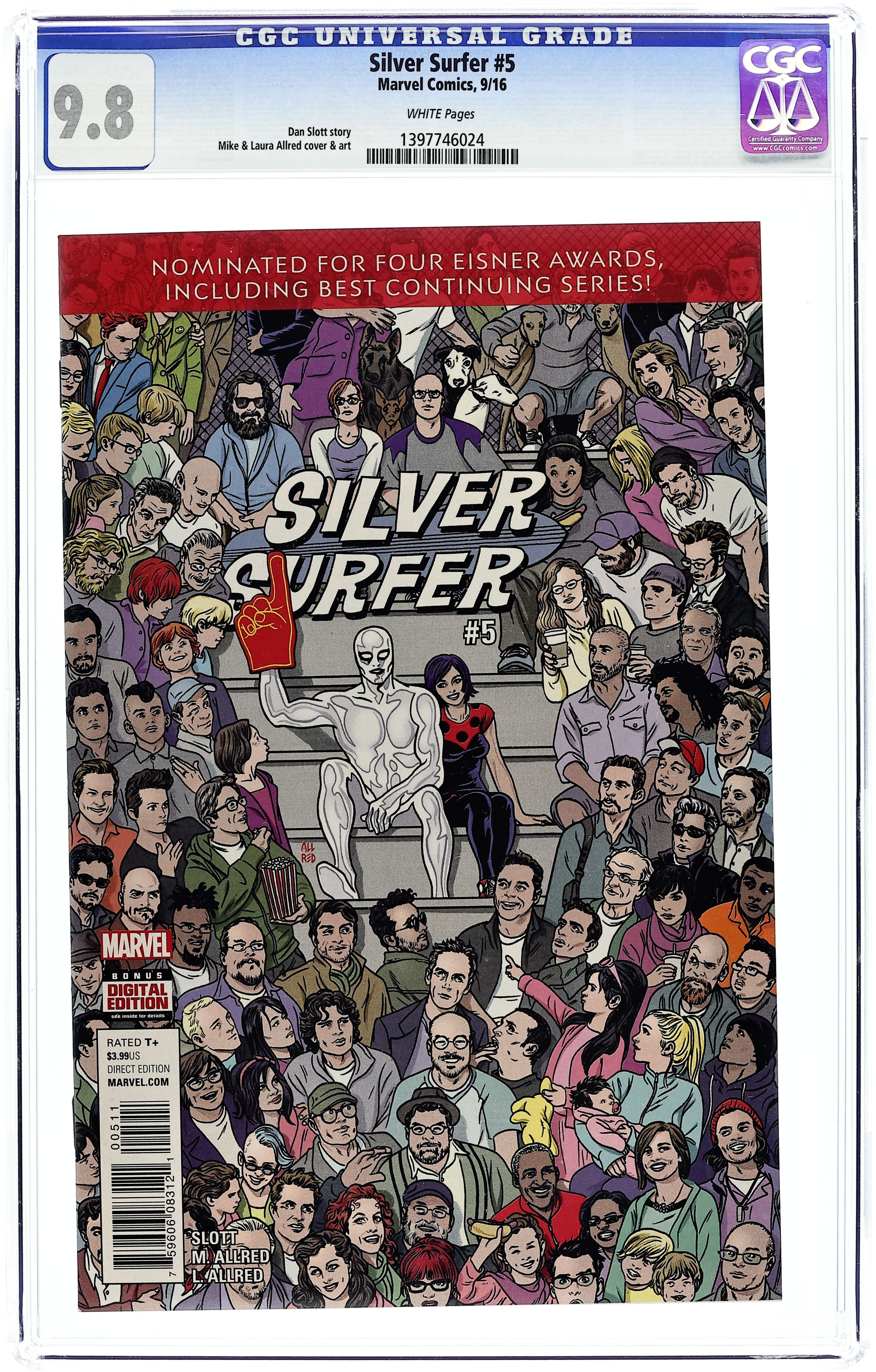 Written by Dan Slott. Art and Cover by Mike Allred. 'Citizen of Earth' STARTS NOW! Are you still reeling from the massive status quo change from SILVER SURFER #3? Think our heroes need a break? No such luck. Because when the Surfer uses his powers to make Dawn's time on Earth 'better', he unintentionally does something so devastating it might scar her for life. Get ready for the shocking revelation... that leads into the 200th Silver Surfer comic! You do NOT want to miss this one, True Believer! Peter Parker cameo. 28 pages, full color. Rated T+ Cover price $3.99.