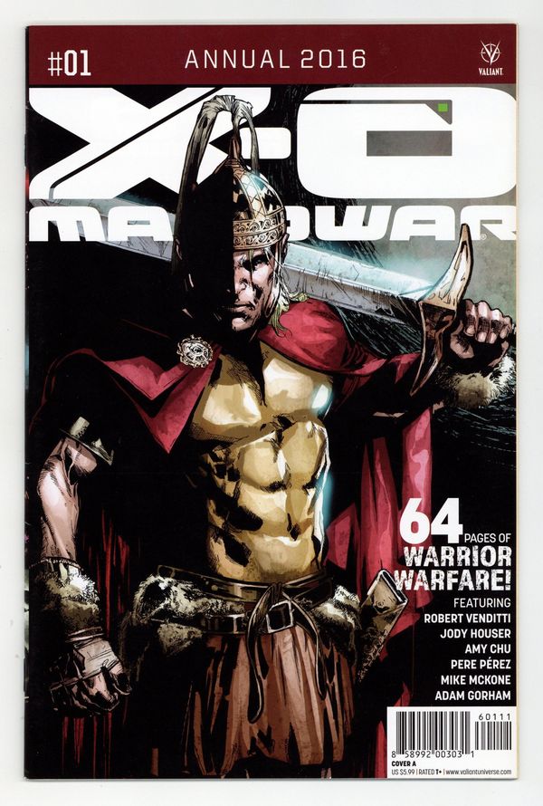 Written by Robert Venditti, Amy chu and Jody Houser. Art by J.G. Jones, Pere Perez, Mike McKone, Adam Gorham and Roberto De La Torres. Cover by Phil Jimenez. Join the adventures of Valiant's flagship hero here with 64-pages of armor-busting action on the frontlines of the Valiant Universe in X-O Manowar's first-ever annual! 2016 is primed and ready to be X-O Manowar's most pivotal year yet! But before Aric of Dacia can confront the biggest threat Earth has ever faced, he must first reflect on the past…and the outcome of a bloodstained battle on the frontier of the Roman Empire that continues to be felt to this day! Then: X-O Manowar's sworn enemy, Commander Trill, readies for the war that is to come…by undergoing a life-threatening trial-by-fire that will test every ounce of his intellect and fury. Plus: Col. Jamie Capshaw must singlehandedly defend G.A.T.E from a menace nobody expected…and the Armorines begin an all-new mission at the heart of X-O Manowar's world! 64 pages, full color. Rated T+ Cover price $5.99.