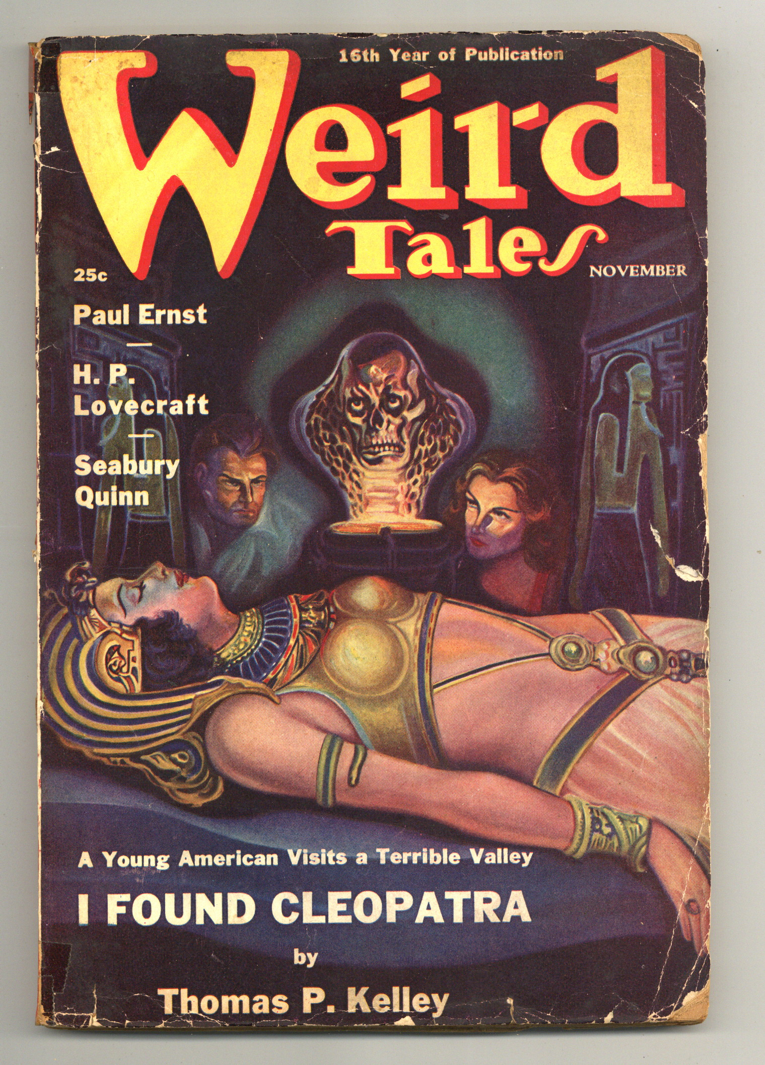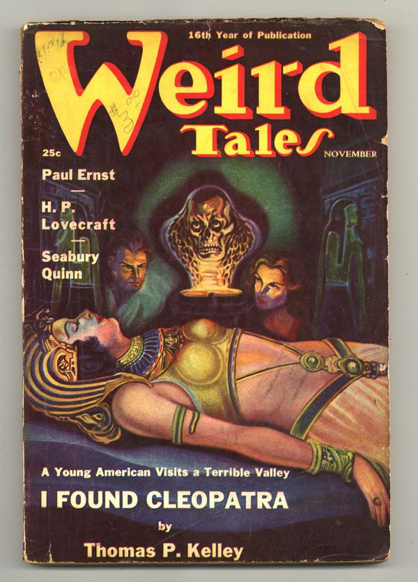 Volume 32, Issue 5 - November, 1938. Cover by A.R. Tilburne. Edited by Farnsworth Wright. Stories by H.P. Lovecraft, Paul Ernst, Seabury Quinn, and Thomas P. Kelley. B&W Illustrations. 6 3/4-in. x 10-in.; black and white; 128 newsprint pages. Cover price $0.25.