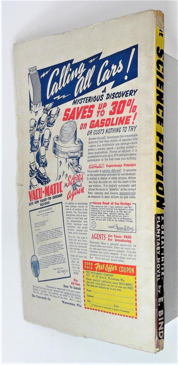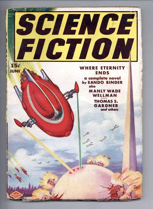Ends Dec 8 9:18 PM CST Bid History 3 bids Current Bid $11 Your Secret Max Bid If you'd like to bid, please log in or register. Science Fiction and adventure stories pulp magazine. Cover by Frank R. Paul (depicting a spaceship attack on 1939 World's Fair). "Where Eternity Ends" by Eando Binder, plus stories by Dom Passante, Robert Castle, Manly Wade Wellman, Paul Edmonds, Thos. S. Gardner, and John Coleridge. Illustrations by Frank R. Paul, Jack Binder. 7-in. x 10-in., 130 newsprint pages, black and white (text with illustrations). Cover price $0.15.