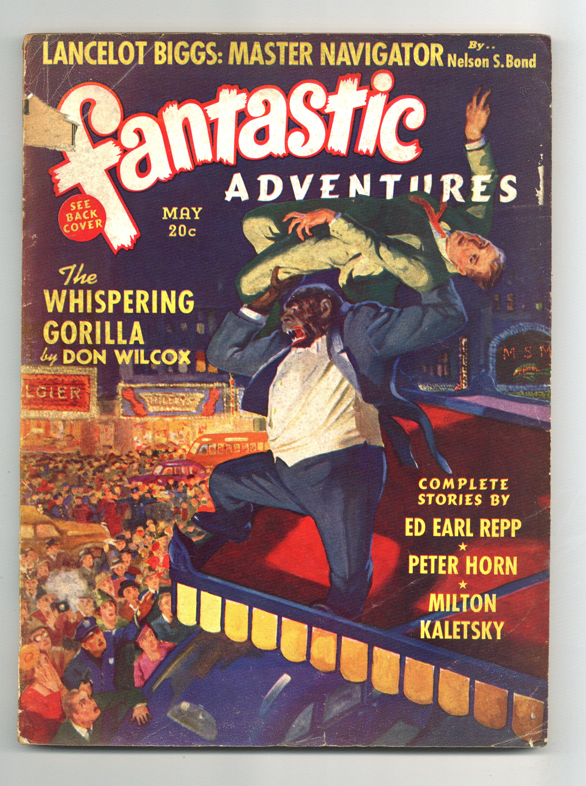 Volume 2, Issue 5 - May 1940. Cover by Stockton Mulford. Science Fiction and adventure magazine. Features "The Whispering Gorilla" by Don Wilcox, "Lanceleot Biggs: Master Navigator" by Nelson S. Bond, and complete stories by Ed Earl Repp, Peter Horn, and Milton Kaletsky. 8-1/2 in. x 11-3/8 in.; black and white; 96 newsprint pages; mostly text with a few illustrations. Cover price $0.20.