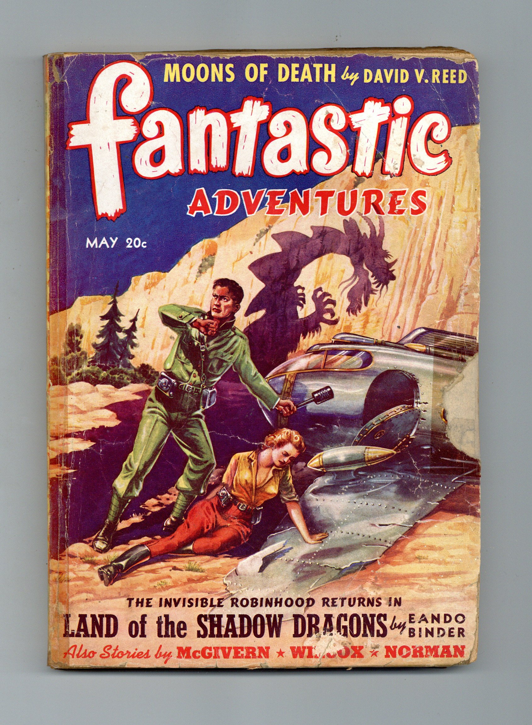 Volume 3, Issue 3 - May 1941. Cover by Robert Fuqua. Science Fiction and Adventures magazine. Features "Moons of Death" by David V. Reed, and "Land of the Shadow Dragons" by Eando Binder. Also features stories by McGivern, Wilcox, and Norman. Softcover Pulp, 7-in x 9 1/2-in, 146 Pages, B&W. Cover price $0.20.