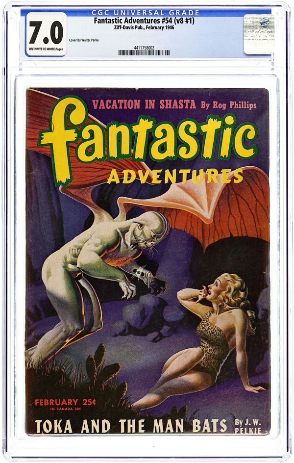 Volume 8, Issue 1 - February 1946. Cover by Walter Parke. Science Fiction and Adventures stories. This issue features Vacation in Shasta" by Rog Phillips, and "Toka and the Man Bats" by J.W. Pelkie. 7-in x 10-in, 180 Pages, B&W. Cover price $0.25.
