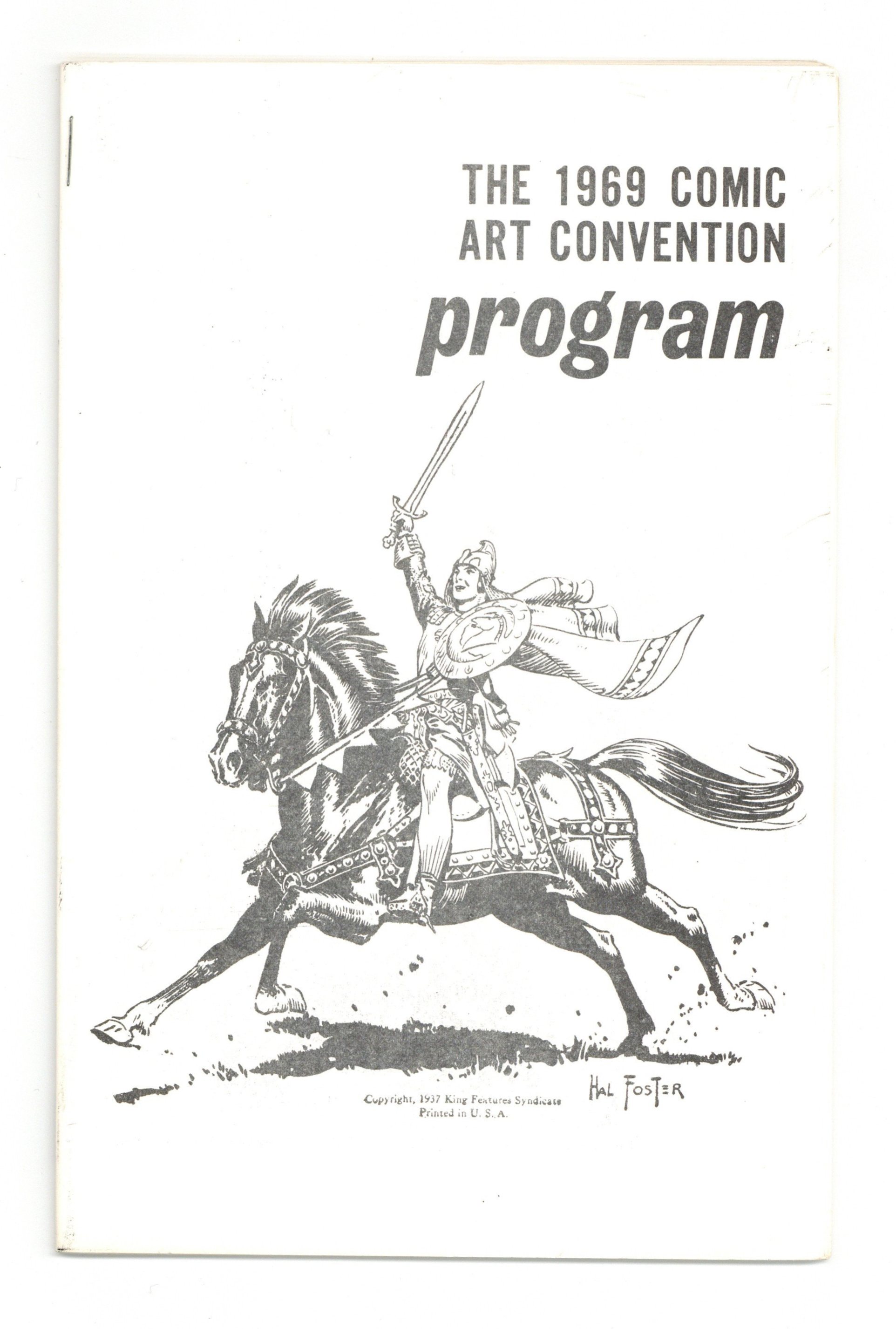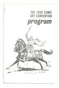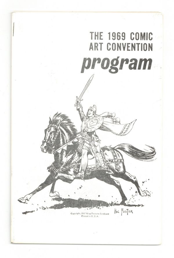 Published Jul 1969 by Phil Seuling.$225.00Phil Seuling's 1969 Comic Art Convention program book. Cover by Hal Foster (creator of Prince Valiant). Biographies on Hal Foster and Harvey Kurtzman (the guests of honor), plus other convention highlights. Paper cover, 5 1/2-in. x 8 1/2-in.; black and white; 40 pages.