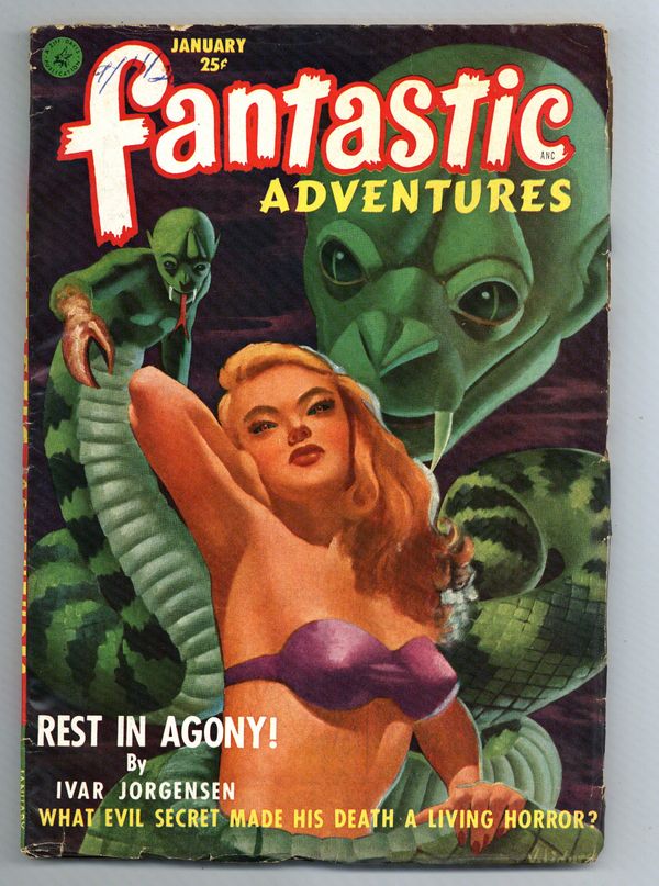 Ziff Davis, NY, 1952. Vol. 14, No. 1. Pulp magazine. Edited by Howard Browne. Cover art by Ed Valigursky for "Rest in Agony" (novel) by Ivar Jorgensen [Paul W. Fairman]. Includes "Wrestlers Are Revolting!" (novelette) by Geoff. St. Reynard; "The Secret of Gallows Hill" by Paul W. Fairman; "When Greed Steps in" (short-short) by F. G. Rayer; "Satellite of Destruction" (novelette) by Burt B. Liston. Features: "The Editor's Notebook"; "That's Fast, Brother!" by Dale Lord; "The Wrath of Rust" by Wilton Avery MacDonald; "Xenon for the Future" by June Lurie; "DDT - The Merciful" by Jon Barry; "One De-Gaussing Girlde, please" by A. T. Kedzie; "No Heartaches on the Moon" by Salem Lane; "The Robot with the Spying Eyes" by Merritt Linn; "Smashed - One Satellite!" by Rita Glanzman; "More Science - More Future" by Walt Crain; "Morpheus in Hades!" by E. Bruce Yaches; "The Girl Was a Killer!" by John Weston; "Man Is Not Alone" by Carter T. Wainwright; "Pipelines Carry Juice" by L. A. Burt; "The Dying Protest" by Glen Otis; "The Flying Eggbeater" by Russell Newton Roman; "Repulsion Attracts" by Tom Lynch; "Terran Treachery Trips Luna" by Charles Recour; "Reader's page"; "To the Ends of the Earth" by Jonathan Peterson. Illustrated by Ed Emsler, Tom Beecham, Virgil Finlay, and Leo Ramon Summers. Letters from Terry Carr and others. Softcover Pulp, 7-in x 10-in, 134 Pages, B&W. Cover price $0.25.