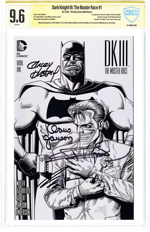 - Witnessed Signatures: Andy Kubert on 5/5/2024, Brian Azzarello & Klaus Janson on 10/18/2024 & Frank Miller on 10/19/2024. Third Eye Comics B&W Variant.