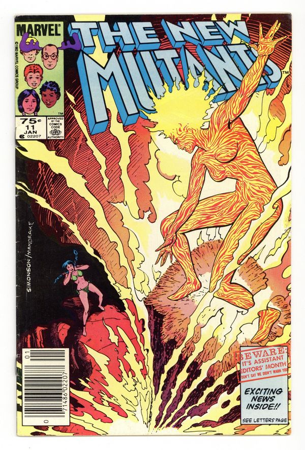 Canadian edition with $.75 cover price. Assistant editors' month. Cover pencils by Walt Simonson, inks by Tom Mandrake. Magma, script by Chris Claremont, pencils by Sal Buscema, inks by Tom Mandrake; As Amara battles Selene, the New Mutants help Amara's father defeat Gallio; Sunspot learns the truth about his father; the New Mutants rescue Psyche and Amara; and Amara, a mutant, wonders whether she will become like the New Mutants, or like Selene. 36 pgs. Cover price $0.75.