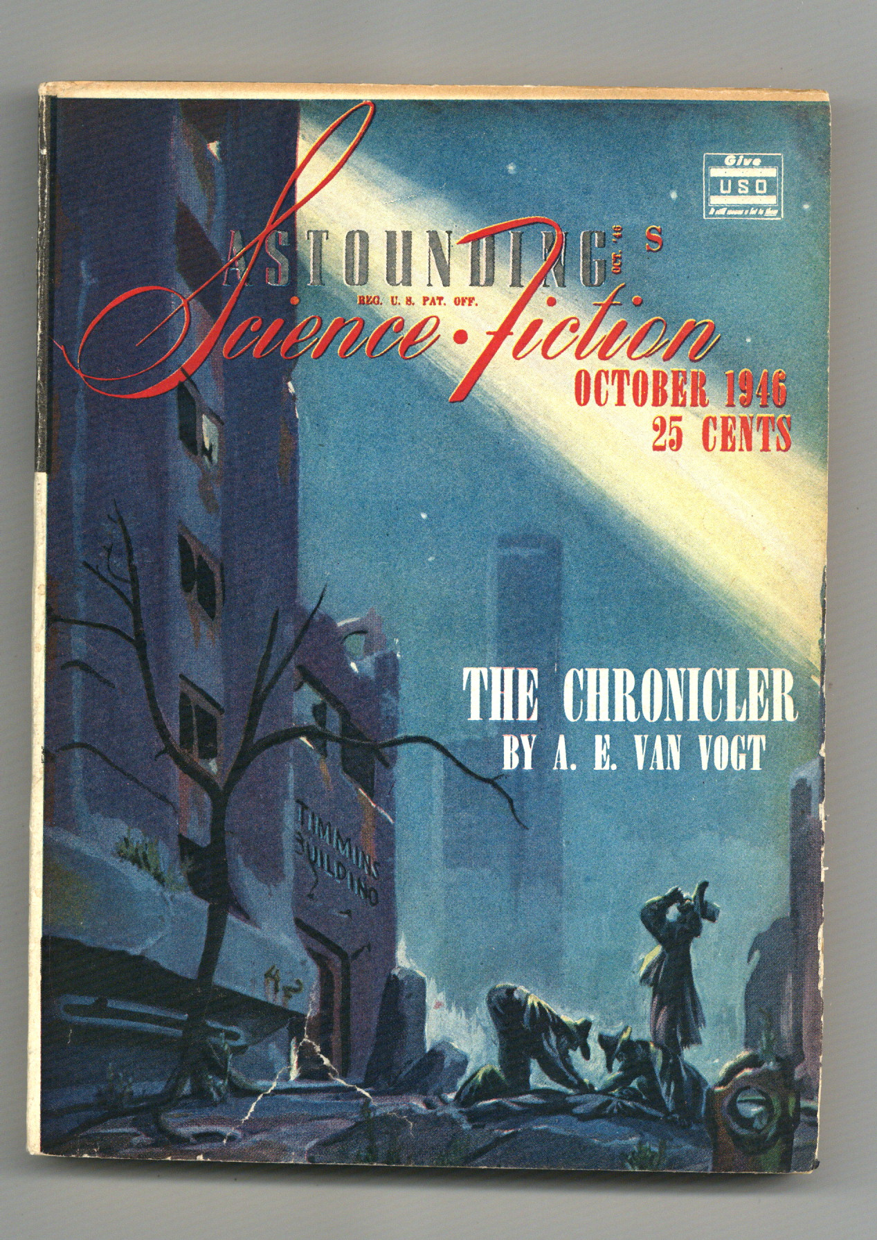 Published Oct 1946 by Street & Smith.$33.00Volume 38, Issue 2 - October, 1946. Cover by William Timmins. Edited by John W. Campbell, Jr. Art Illustrations by Swenson. "The Chronicler" by A. E. Van Vogt, "Chaos, Co-ordinated" by John MacDougal, "Assumption Unjustified" by Hal Clement, "False Dawn" by A. Bertram Chandler, "Alien" by George O. Smith, "To still the drums" by Chan Davis. Science Fiction and adventure stories. 5.5-in. x 7.5-in., 180 pages, B&W. Cover price $0.25.