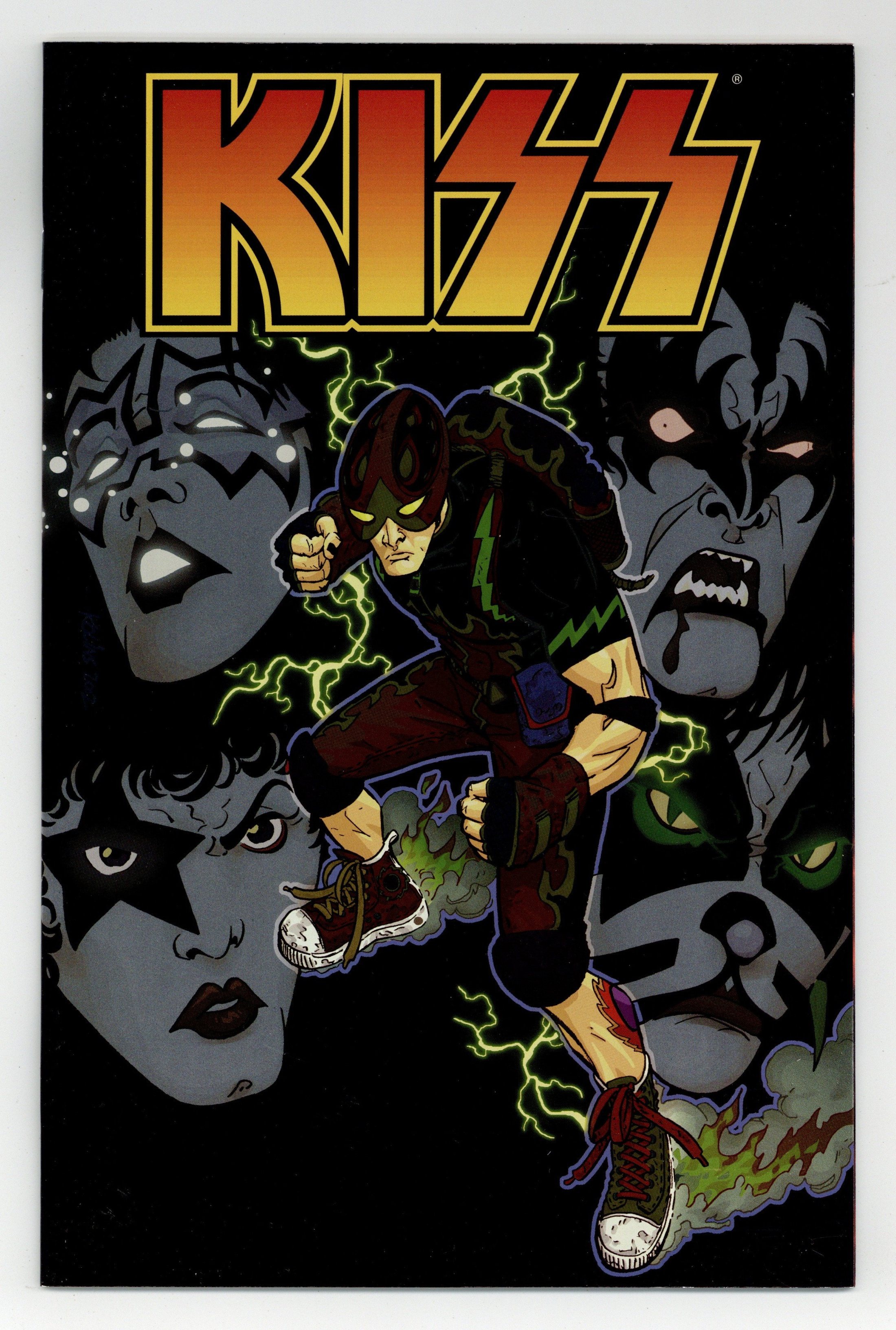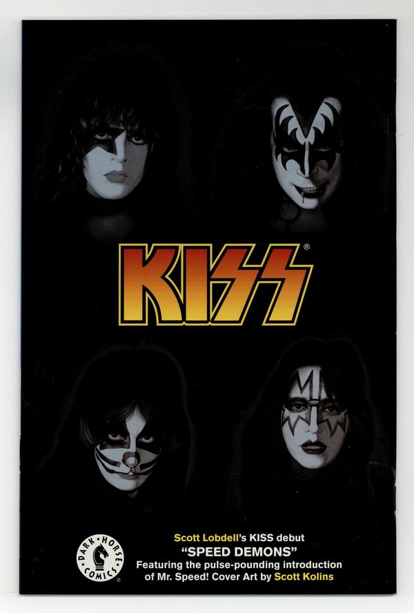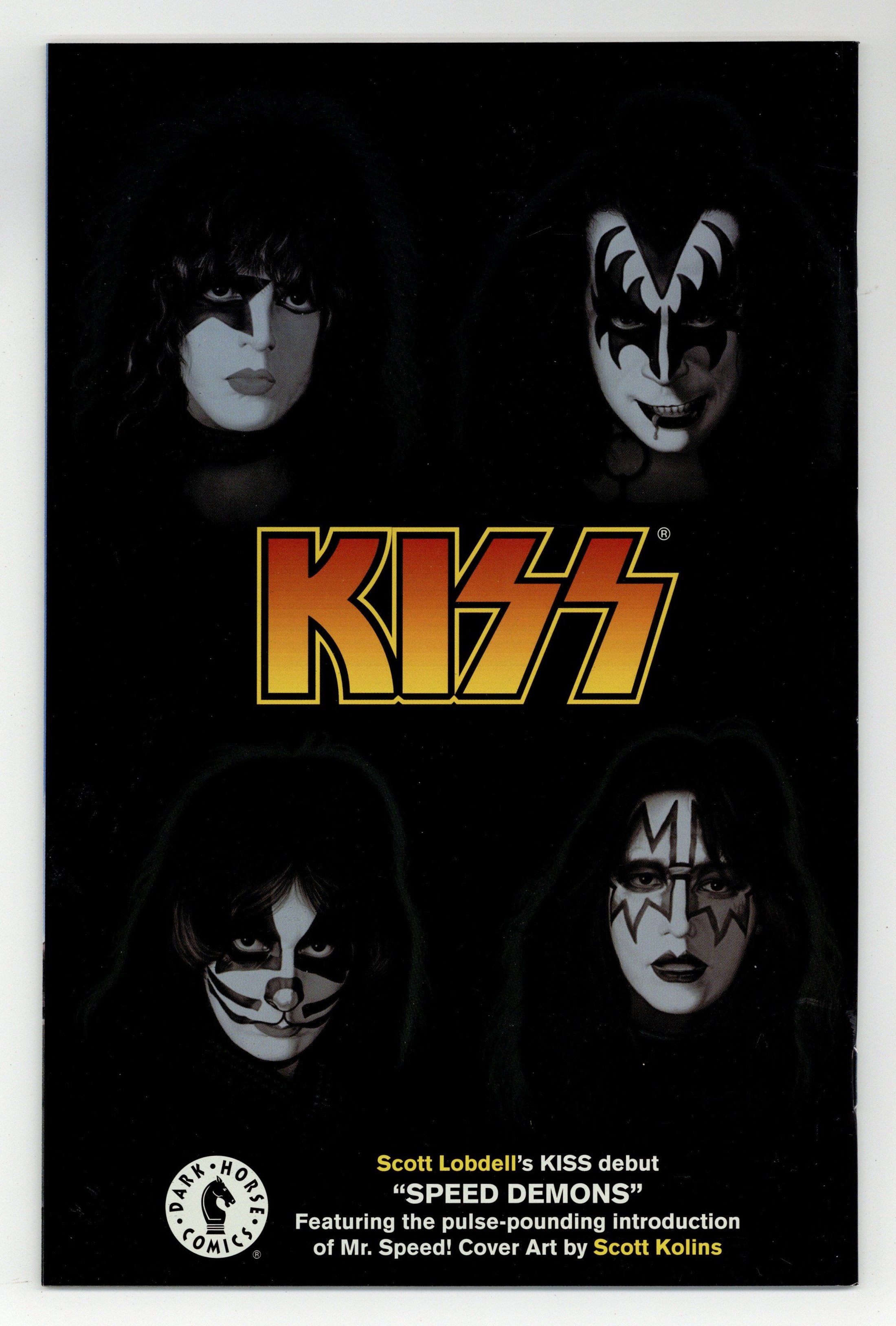 Published Feb 2003 by Dark Horse.$48.00Chrome cover with photo cover underneath. by SCOTT LOBDELL and PETER VALE cover by SCOTT KOLINS The hottest young girl on the Lower East Side's been invited to a rave, but it turns out she's the only guest and the main course. A beautiful young girl's life at stake. Sounds like a perfect job for returned super-group Kiss. Instead, the new ace in town, Mr. Speed comes to the rescue! Designed by Scott Kolins (The Flash), who provides this month's in-your-face cover, this fast-moving new guy on the block poses more problems for the Four Who Are One, who aren't sure if he's friend or foe. Beginning an explosive new direction in the comic, new writer Scott Lobdell (Buffy, High Roads, X-Men) and guest artist Peter Vale pull out all the stops in this action-packed, stand-alone story. On sale February 26 FC 32pg (Kolins cover) . . . $2.99 FC 32pg (Photo cover) . . . $2.99 Cover price $2.99.