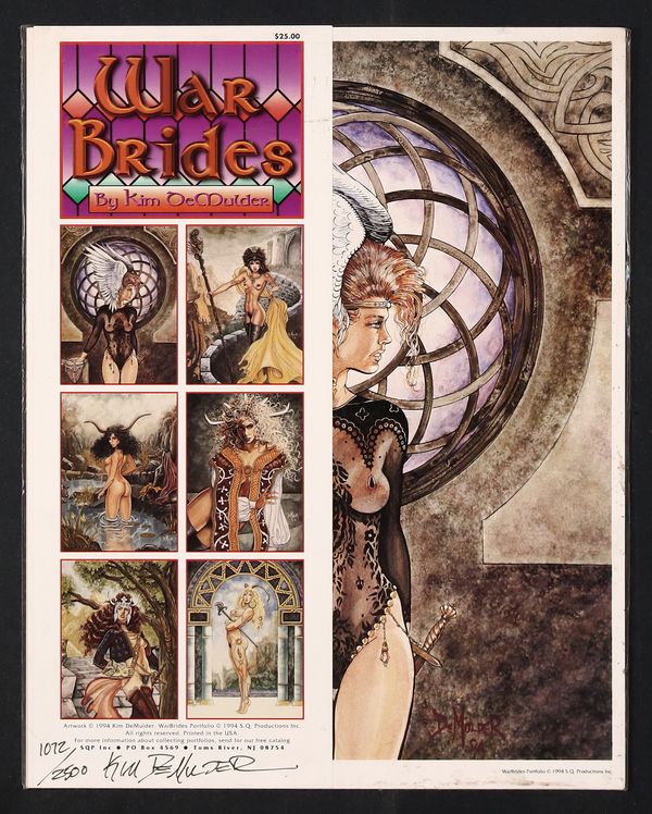 $9.00War Brides is a 6-piece portfolio by Kim DeMulder. Known for her work in the field of fantasy, DeMulder captures the sensual beauty and grace of unfettered warrior-women. This set includes 6 beautifully painted 11 x 14 pieces depicting visions of alluring beauty and fantastic landscapes. Full color. Cover price $25.00.