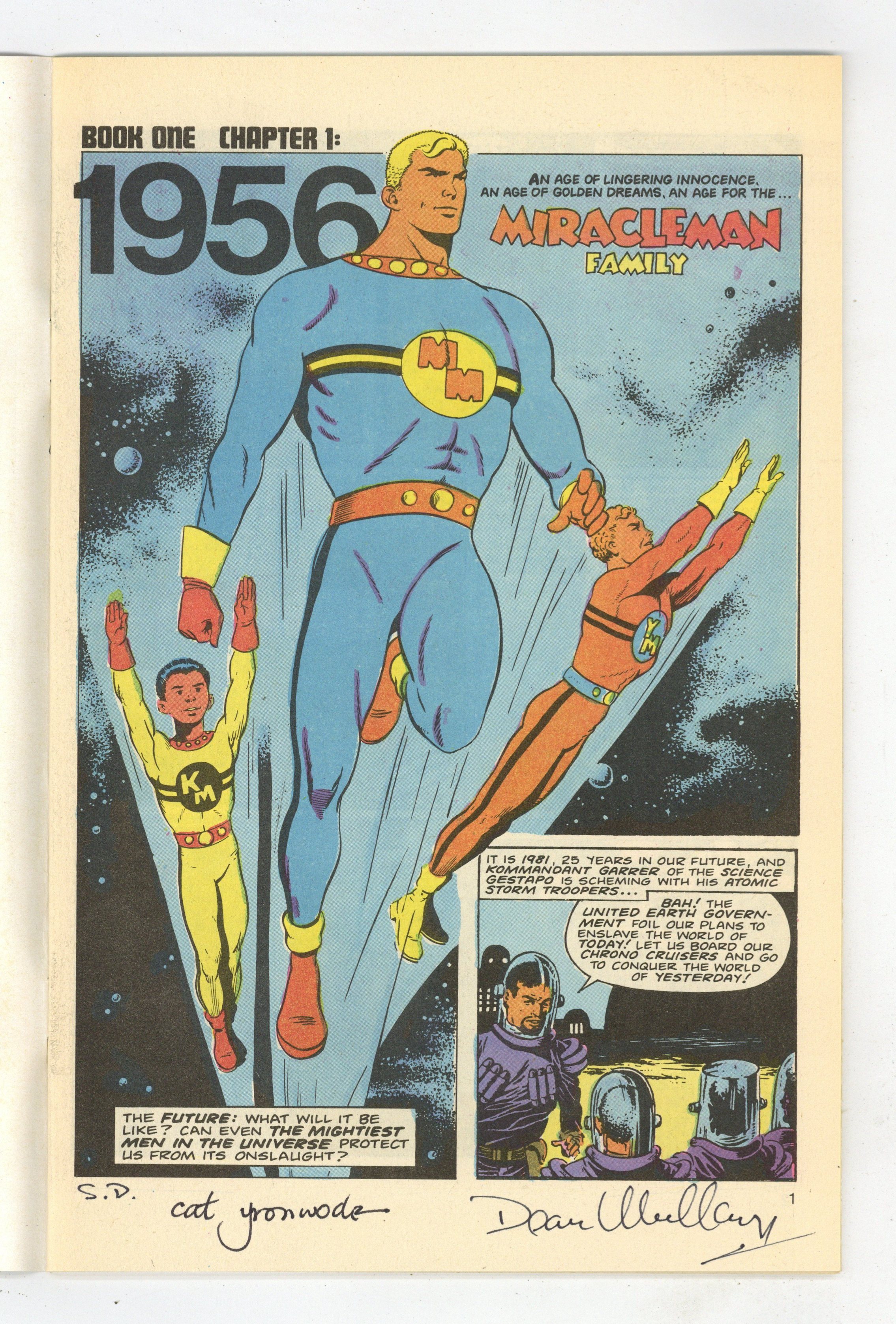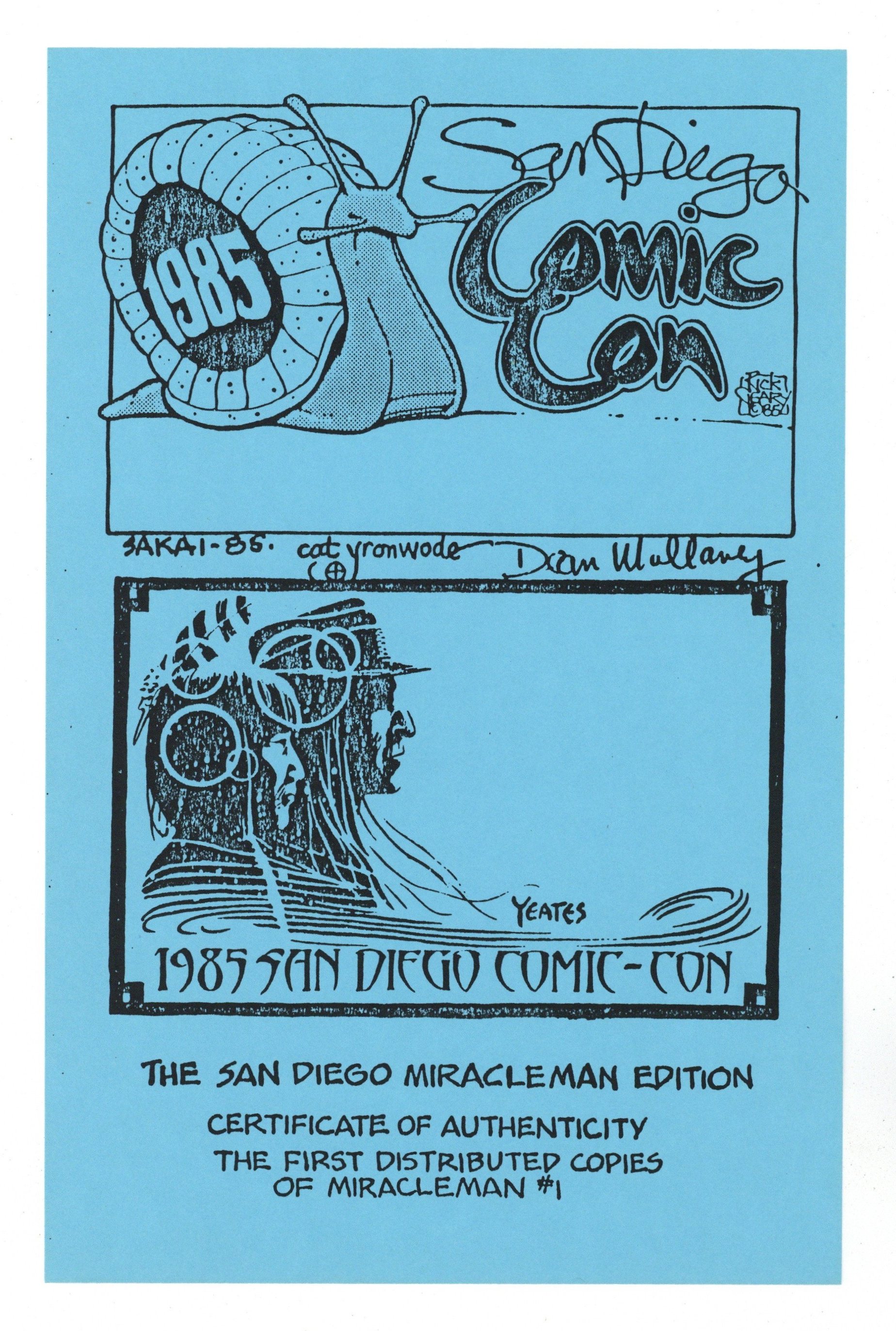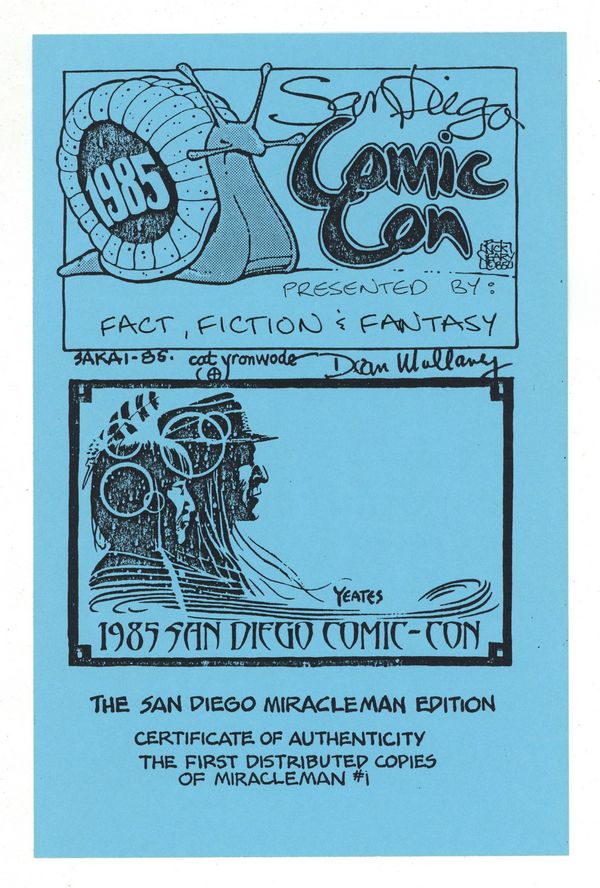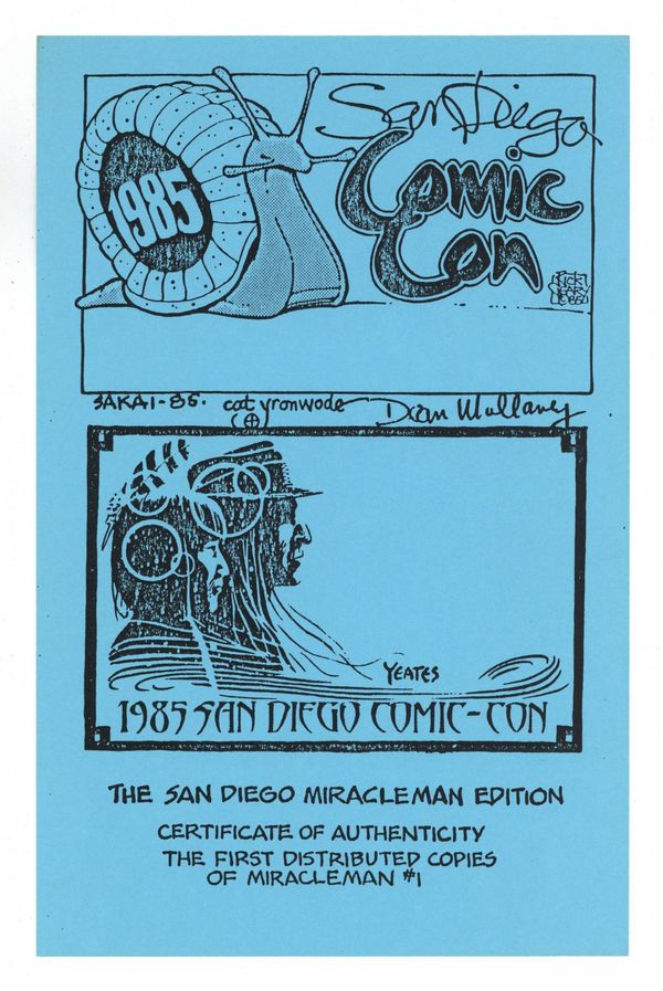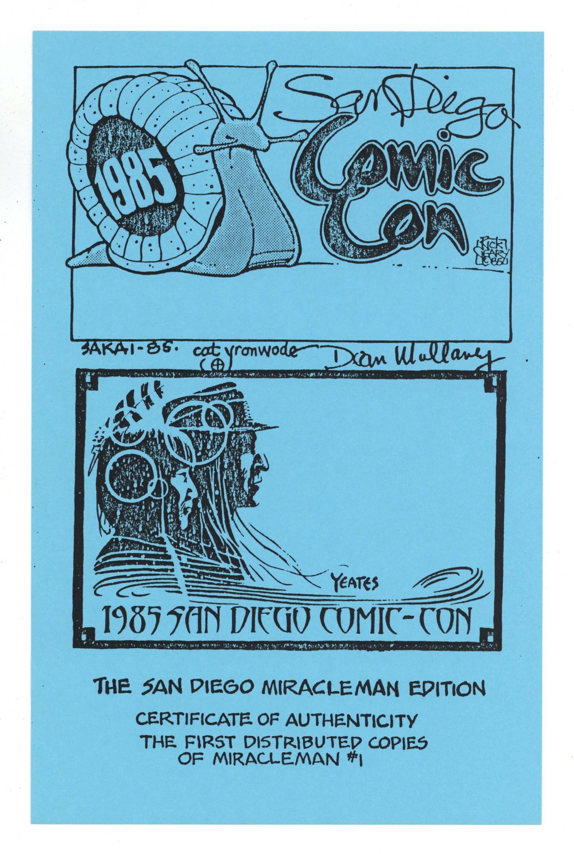 Blue San Diego Miracleman Edition with BLUE certificate of authenticity. Signed by Cat Yronwode and Dean Mullaney (interior) but not numbered. NOTE: The blues are part of the first 1000 copies of Miracleman #1 printed. The first 400 with gold certificates are signed & numbered by Alan Moore. The remaining 600 were given blue certificates and signed by Cat Yronwode and Dean Mullaney but not numbered. These first 1000 copies all have a printing crease on the front cover. CONTENT INFO: Written by Alan Moore, with art by Gary Leach. Mickey Moran was just a regular bloke with a wife and a job, until one day he *remembered*...that he was Miracleman, a glistening new god with powers far beyond those of mortal ken. He also remembered that, years ago, he and his sidekicks -- Young Miracleman and Kid Miracleman -- were in a horrible accident that left Young Miracleman dead. When Moran goes to see Kid Miracleman to help him piece together his past, our hero finds that his youthful protege has changed...for the worse. Much worse. If you've never read this series, be assured it ranks right up there with Alan Moore's other classic, Watchmen. Cover price $0.75.