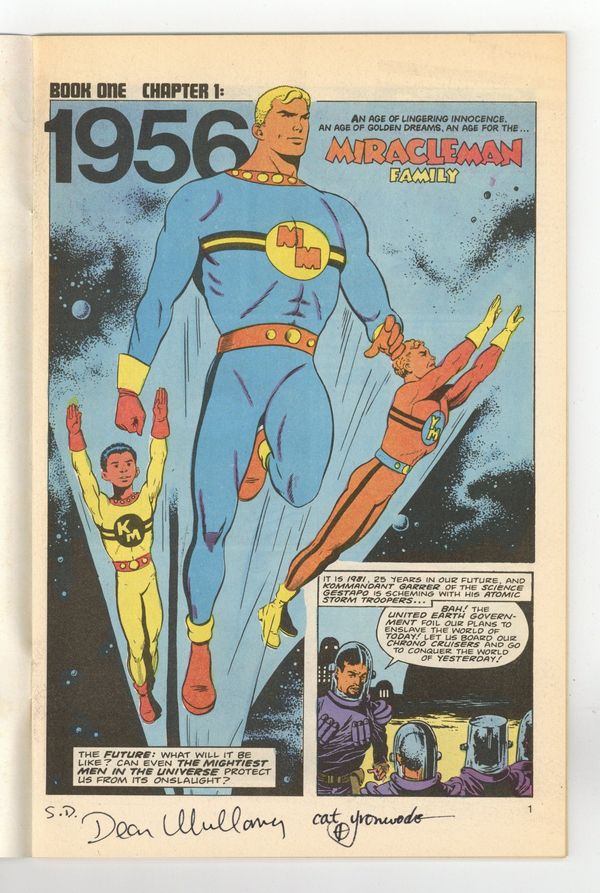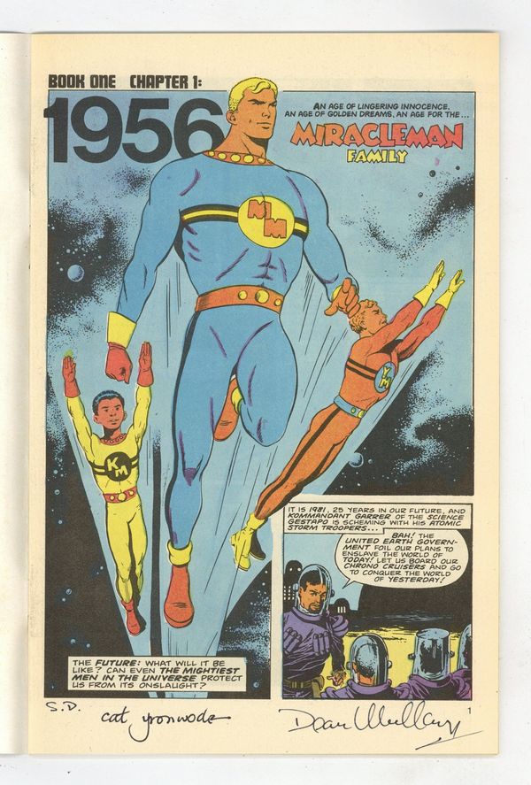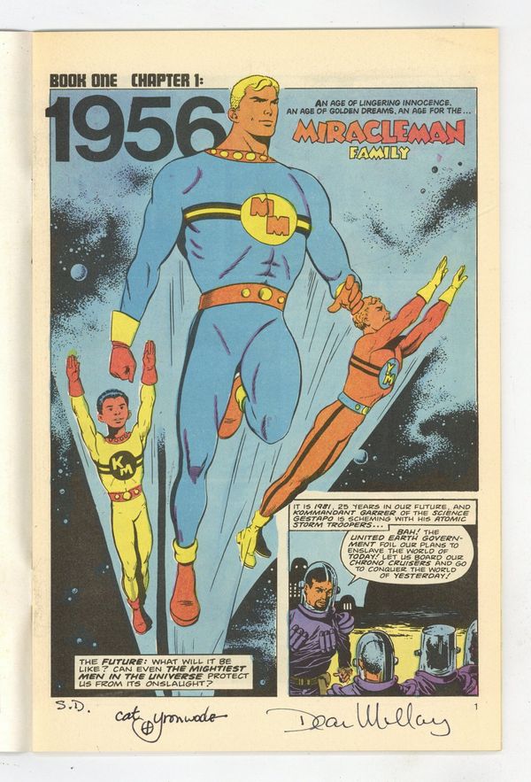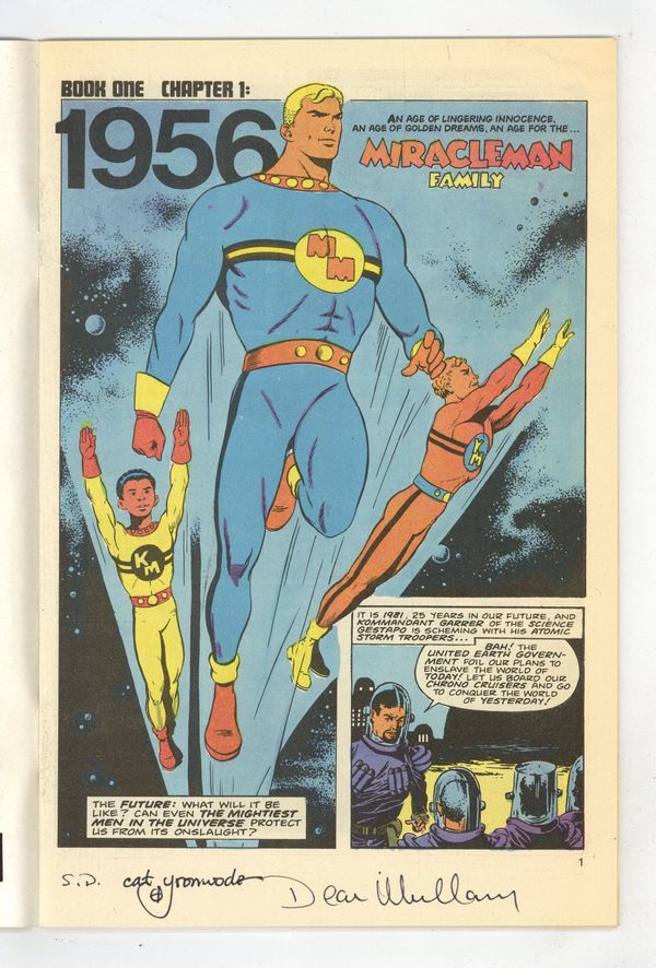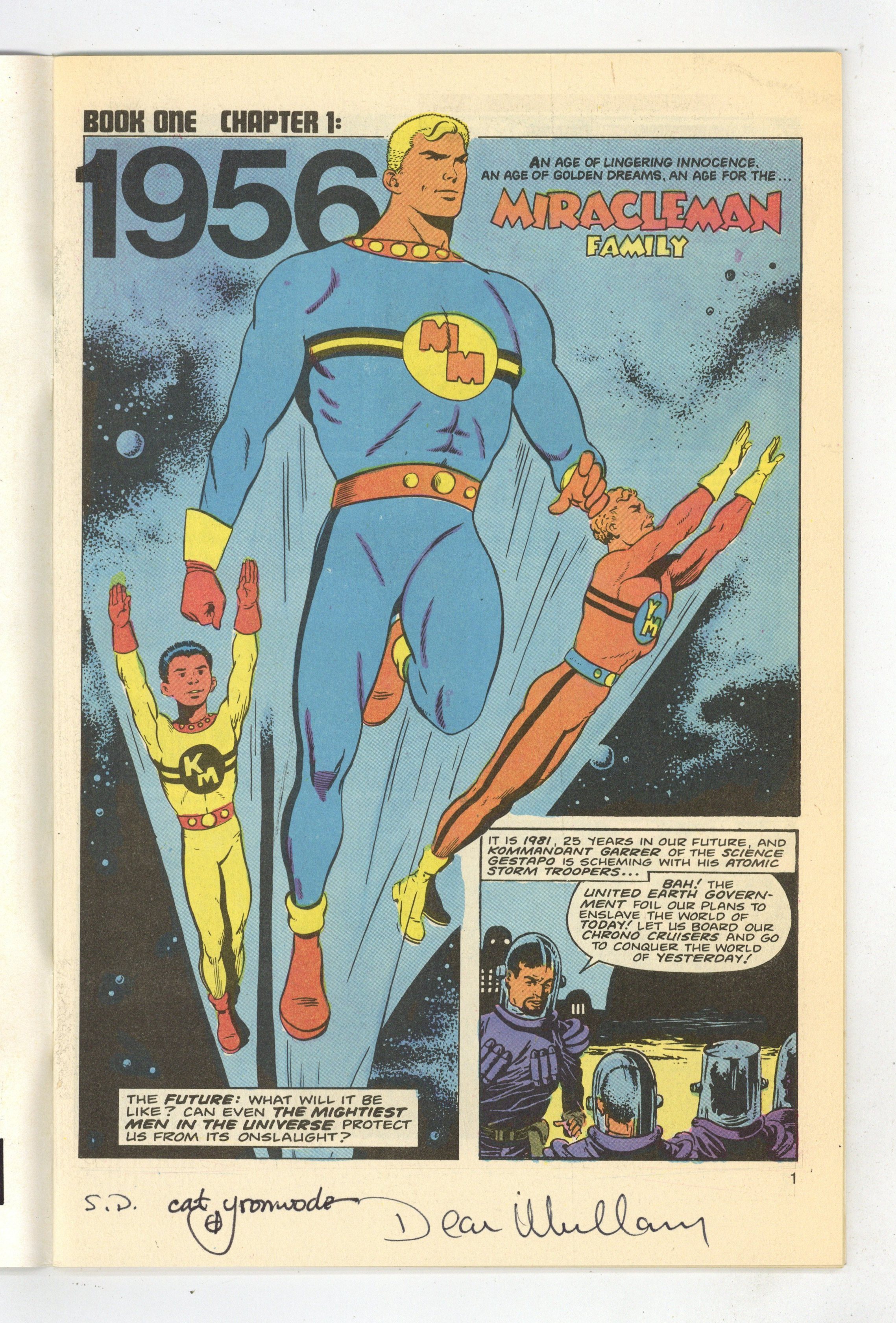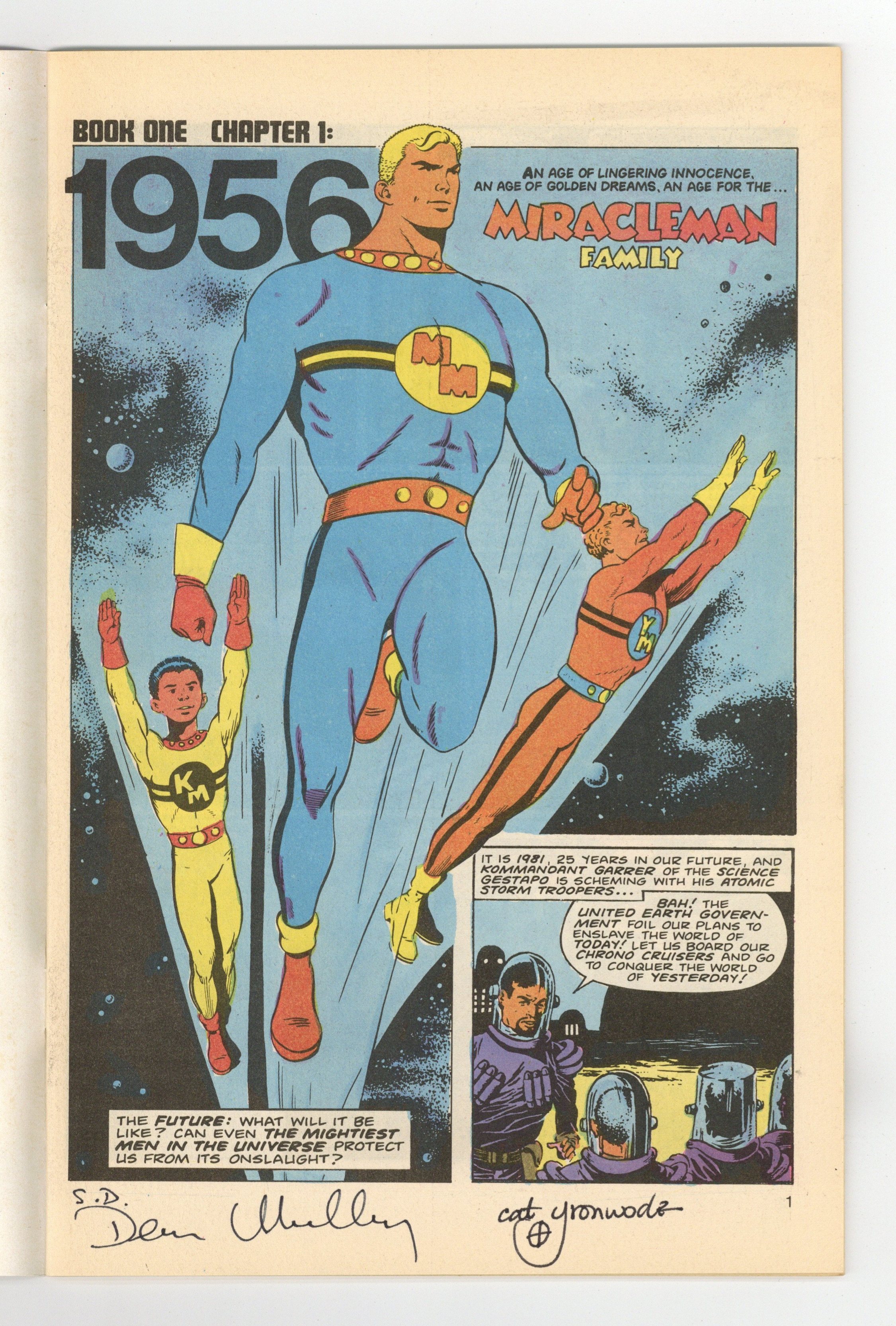 Blue San Diego Miracleman Edition with BLUE certificate of authenticity. Signed by Cat Yronwode and Dean Mullaney (interior) but not numbered. NOTE: The blues are part of the first 1000 copies of Miracleman #1 printed. The first 400 with gold certificates are signed & numbered by Alan Moore. The remaining 600 were given blue certificates and signed by Cat Yronwode and Dean Mullaney but not numbered. These first 1000 copies all have a printing crease on the front cover. CONTENT INFO: Written by Alan Moore, with art by Gary Leach. Mickey Moran was just a regular bloke with a wife and a job, until one day he *remembered*...that he was Miracleman, a glistening new god with powers far beyond those of mortal ken. He also remembered that, years ago, he and his sidekicks -- Young Miracleman and Kid Miracleman -- were in a horrible accident that left Young Miracleman dead. When Moran goes to see Kid Miracleman to help him piece together his past, our hero finds that his youthful protege has changed...for the worse. Much worse. If you've never read this series, be assured it ranks right up there with Alan Moore's other classic, Watchmen. Cover price $0.75.