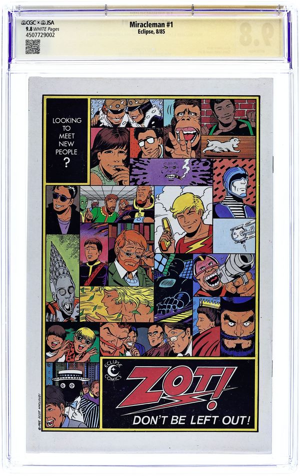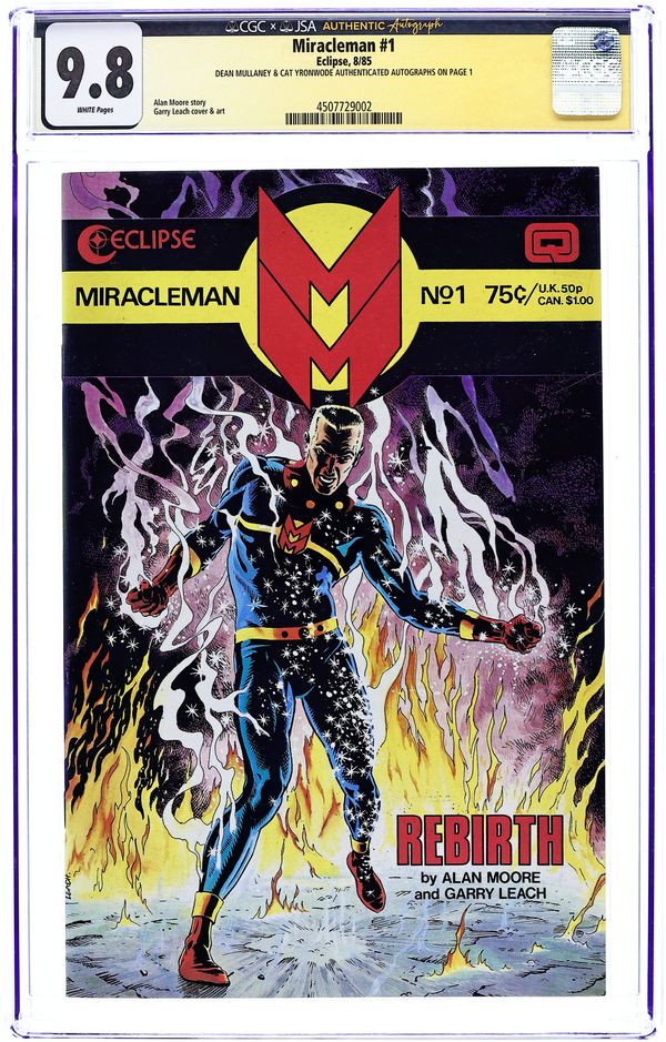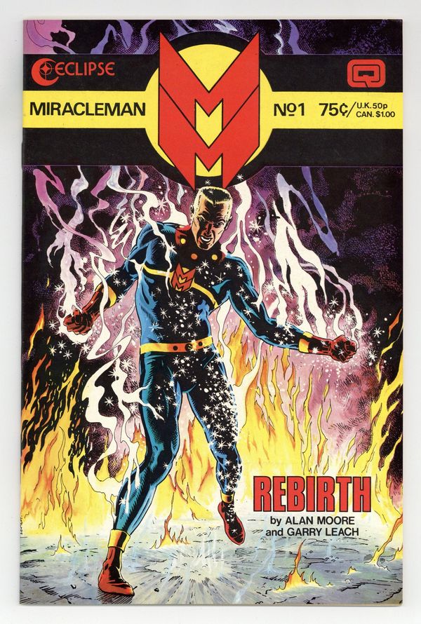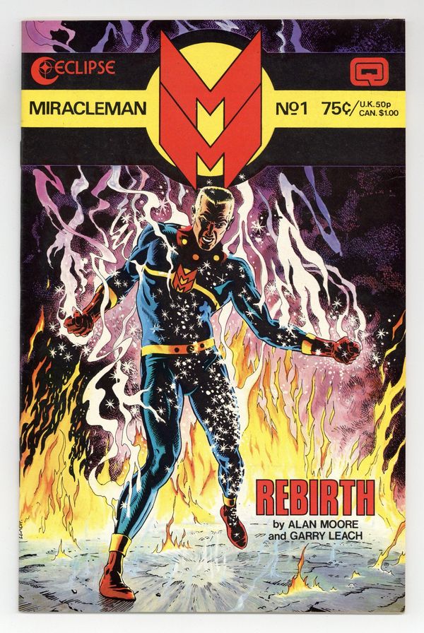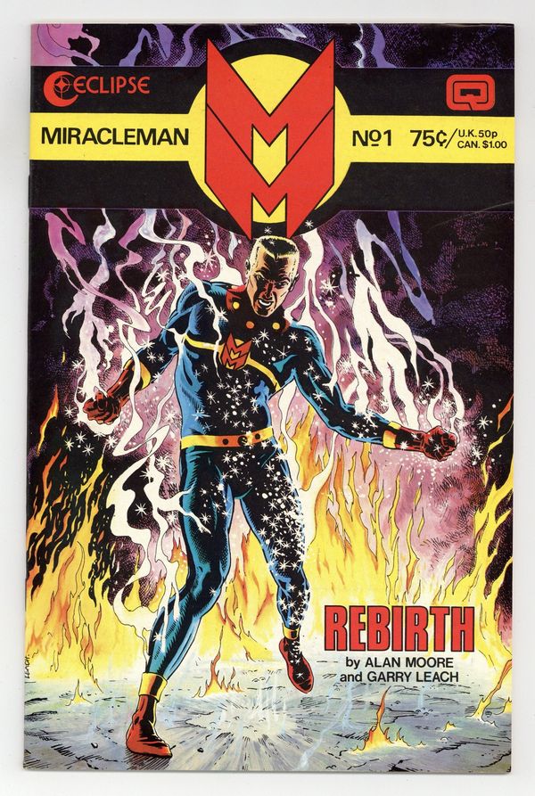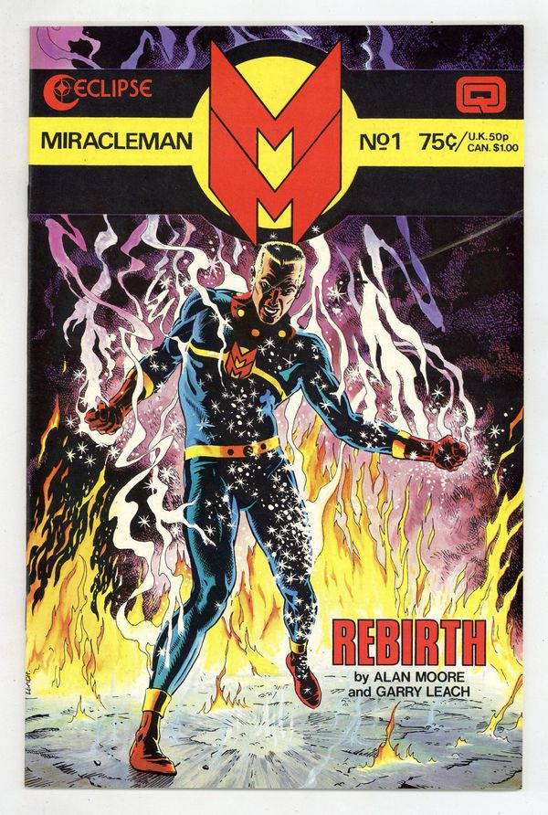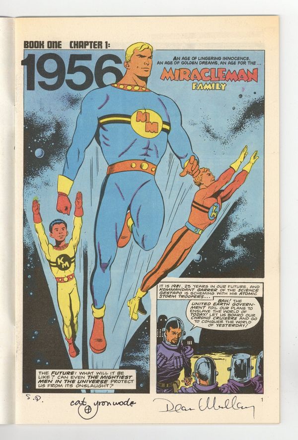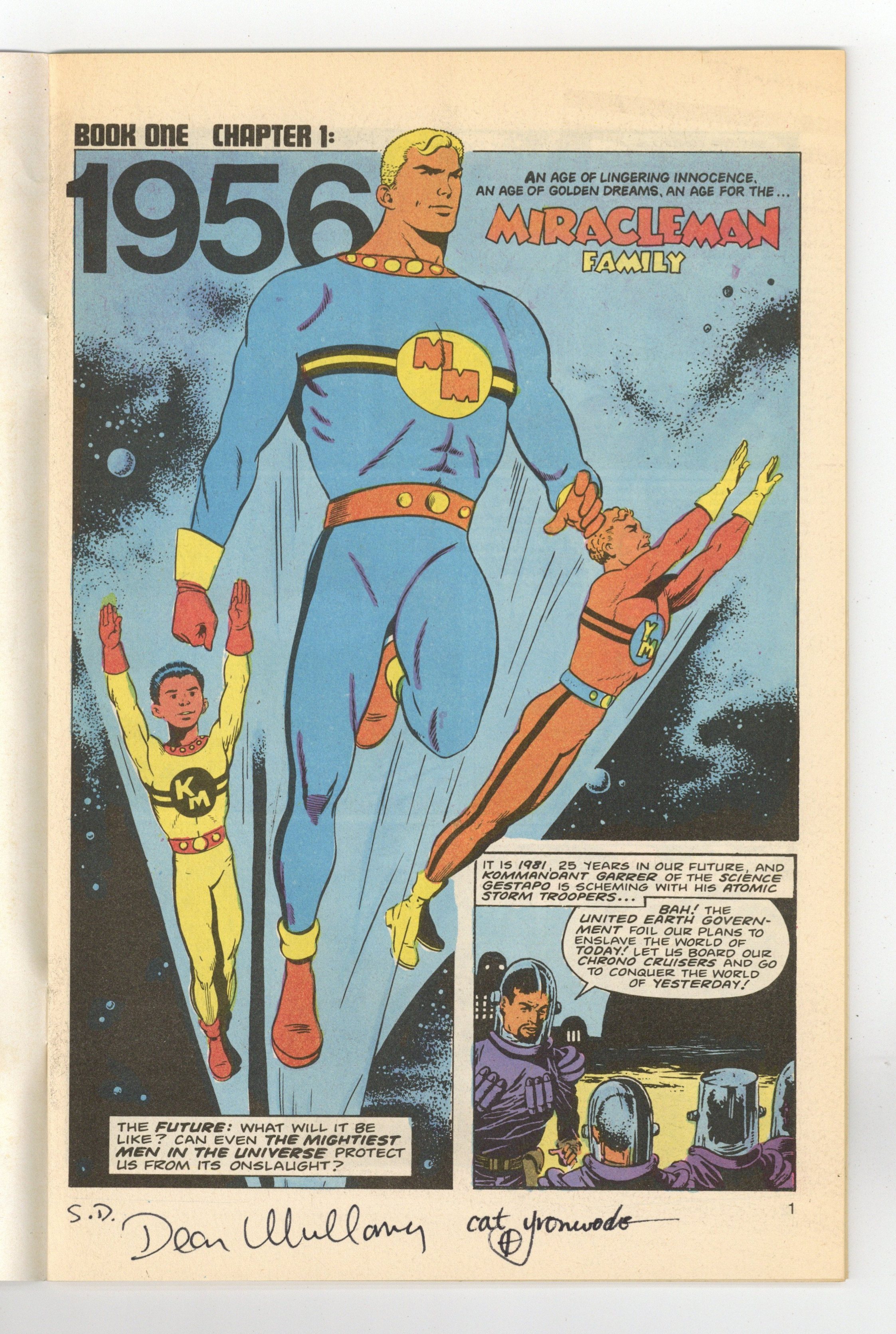 Blue San Diego Miracleman Edition with BLUE certificate of authenticity. Signed by Cat Yronwode and Dean Mullaney (interior) but not numbered. NOTE: The blues are part of the first 1000 copies of Miracleman #1 printed. The first 400 with gold certificates are signed & numbered by Alan Moore. The remaining 600 were given blue certificates and signed by Cat Yronwode and Dean Mullaney but not numbered. These first 1000 copies all have a printing crease on the front cover. CONTENT INFO: Written by Alan Moore, with art by Gary Leach. Mickey Moran was just a regular bloke with a wife and a job, until one day he *remembered*...that he was Miracleman, a glistening new god with powers far beyond those of mortal ken. He also remembered that, years ago, he and his sidekicks -- Young Miracleman and Kid Miracleman -- were in a horrible accident that left Young Miracleman dead. When Moran goes to see Kid Miracleman to help him piece together his past, our hero finds that his youthful protege has changed...for the worse. Much worse. If you've never read this series, be assured it ranks right up there with Alan Moore's other classic, Watchmen. Cover price $0.75.
