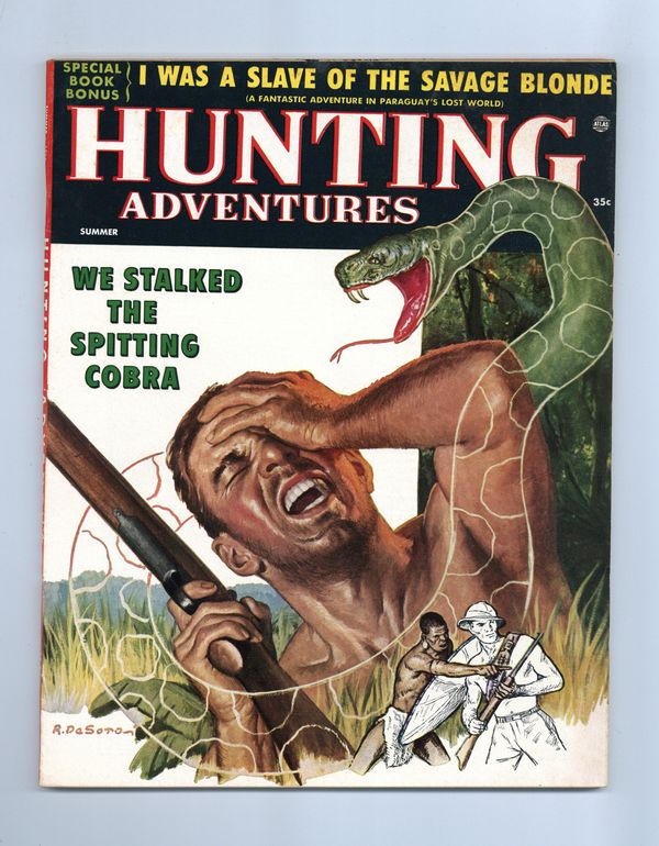 Published Jun 1956 by Newsstand Publications.$214.00Summer 1956. Published by Martin Goodman. Men's magazine focusing on Hunting stories and articles. Cover by Rafael DeSoto. Illustrations by John Leone, Tom Ryan, Bob Maguire. 8 1/2-in. x 11-in., 92 pages, B&W Cover price $0.35.