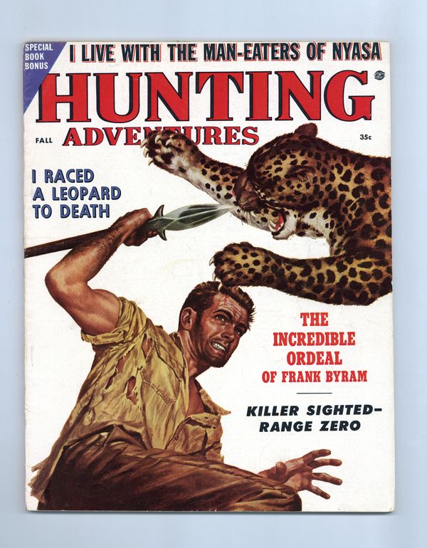 Published Sep 1956 by Newsstand Publications.$31.00Fall 1956. Published by Martin Goodman. Men's magazine focusing on Hunting stories and articles. Cover by John Kuller. Illustrations by Victor Olson, Clark Hulings, Rudy Belarksi, Ferguson, Ray Pioch, Vic Prezio, . 8 1/2-in. x 11-in., 90 pages, B&W Cover price $0.35.
