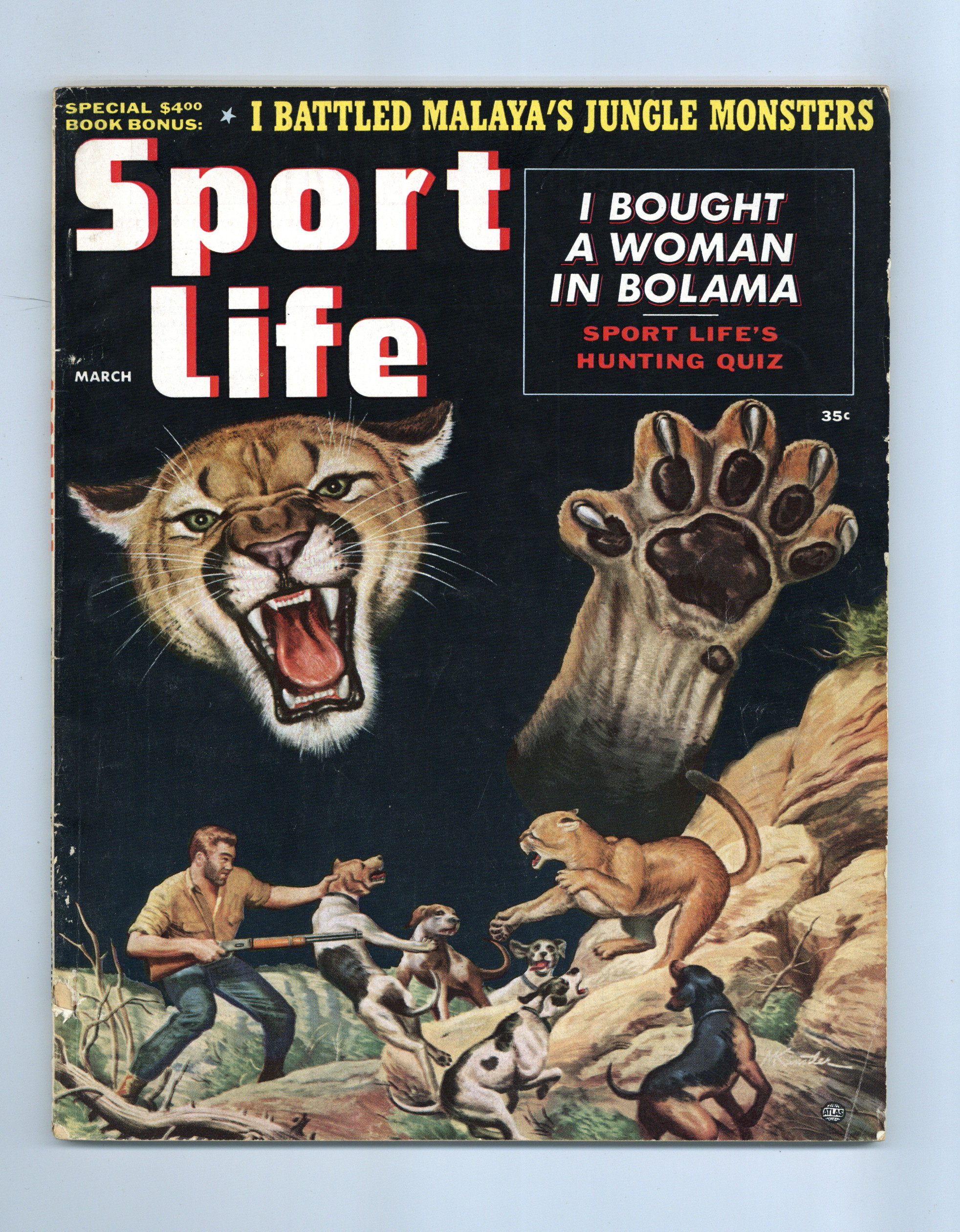 Volume 4, Issue 1 - March 1957. Cover by Mort Kuntstler. Men's interest magazine focusing on hunting, fishing, and fitness articles. 8 1/2-in. x 11-in., 98 pages, B&W Cover price $0.35.