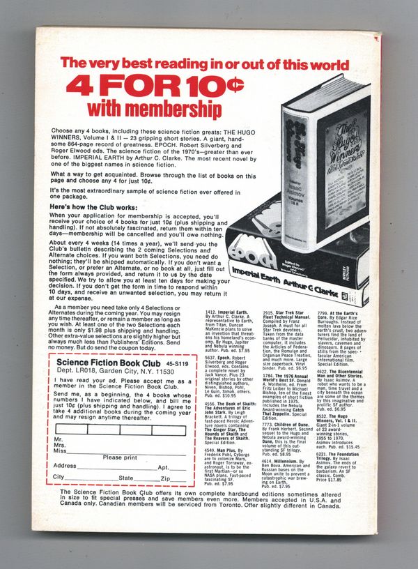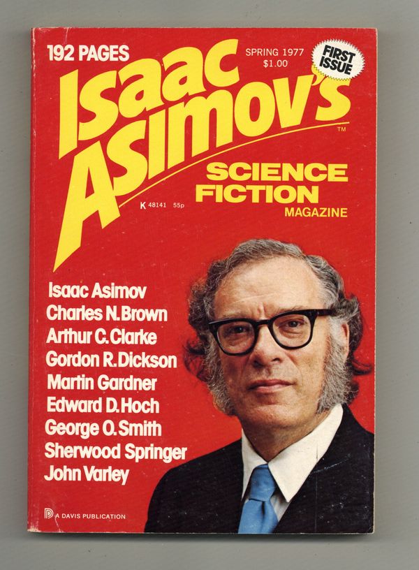 Published Mar 1977 by Davis Publications, Inc..$34.00First Issue. Isaac Asimov photo cover. Stories by Isaac Asimov, Arthur C. Clarke, Edward D. Hoch, Fred Saberhagen, Gordon R. Dickson, and others. Plus articles and editorials. 5 1/4-in. x 7 1/2-in., 192 pages, black and white text. Cover price $1.00.