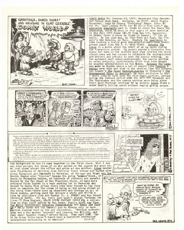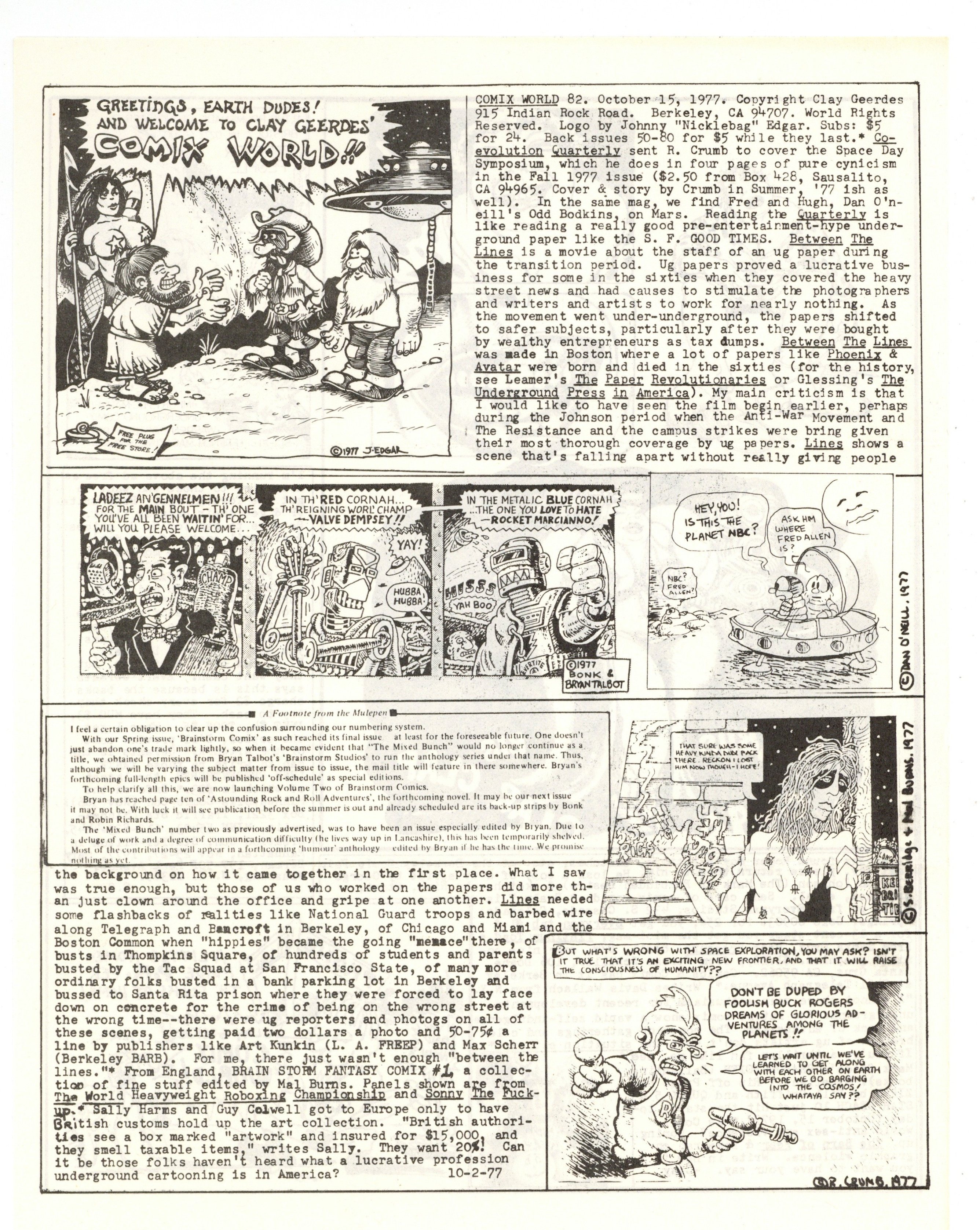 Published Oct 1977 by Clay Geerdes.$26.50October 15, 1977. Newsletter by Clay Geerdes. Contains news of comix, artists of interest, and a general review of what was happening in the underground market. Johnny Edgar, Bryan Talbot, Robert Crumb, and Dan O'Neill art. 8 1/2-in. x 11-in., 2 pages, black and white.