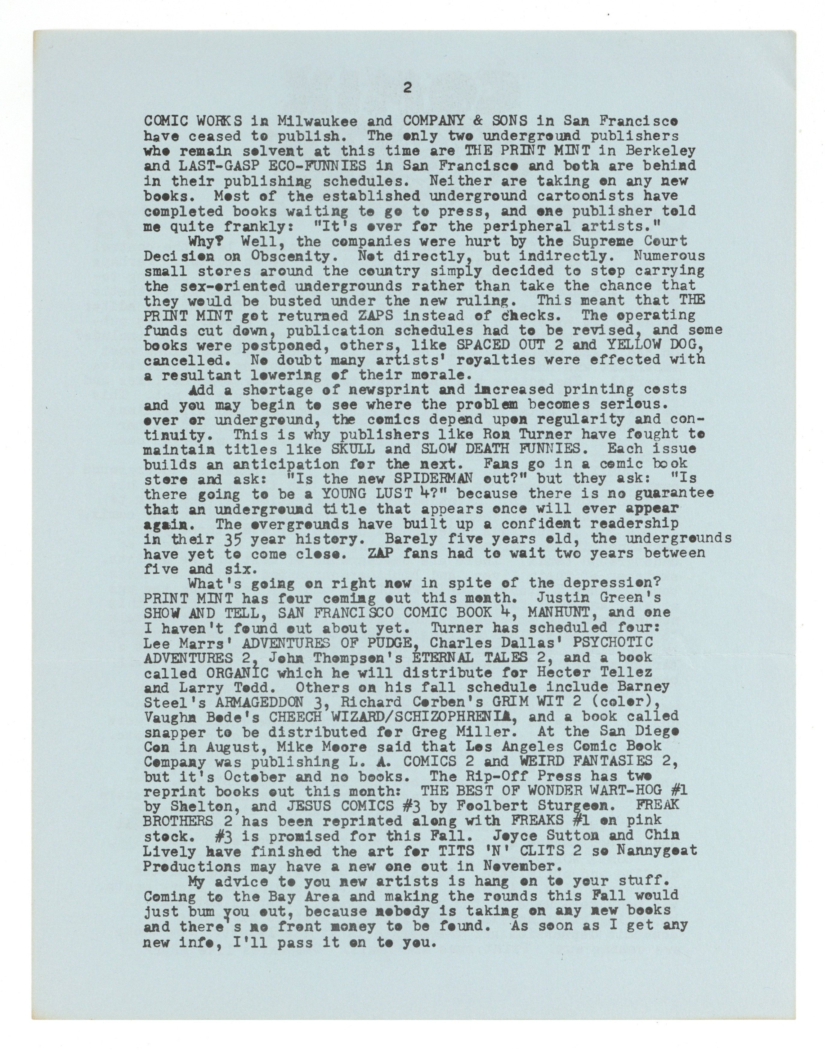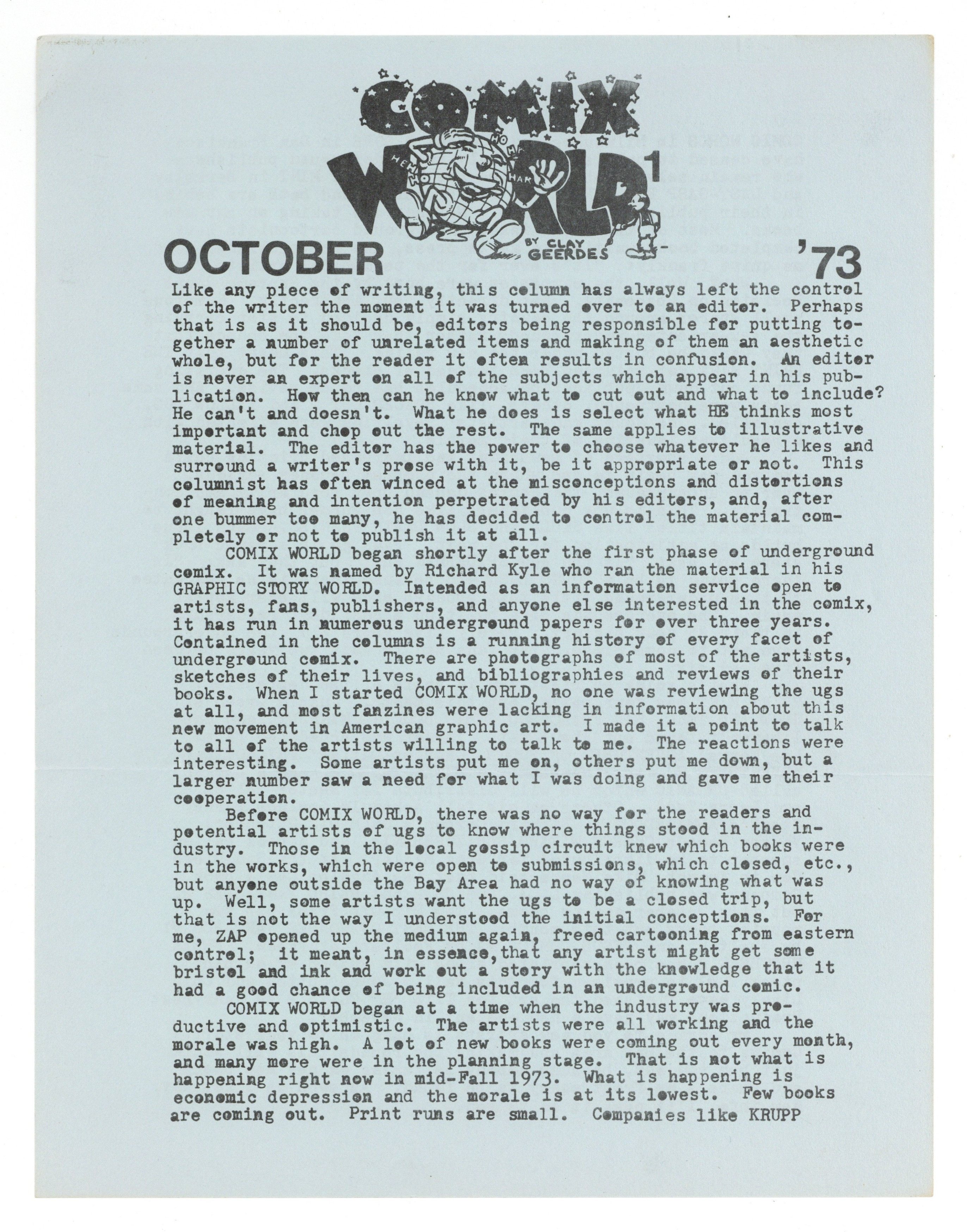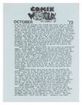 Tags: UndergroundPublished Oct 1973 by Clay Geerdes.$36.50October 1973. Newsletter by Clay Geerdes. Contains news of comix, artists of interest, and a general review of what was happening in the underground market. 8 1/2-in. x 11-in., 2 pages, black and white.