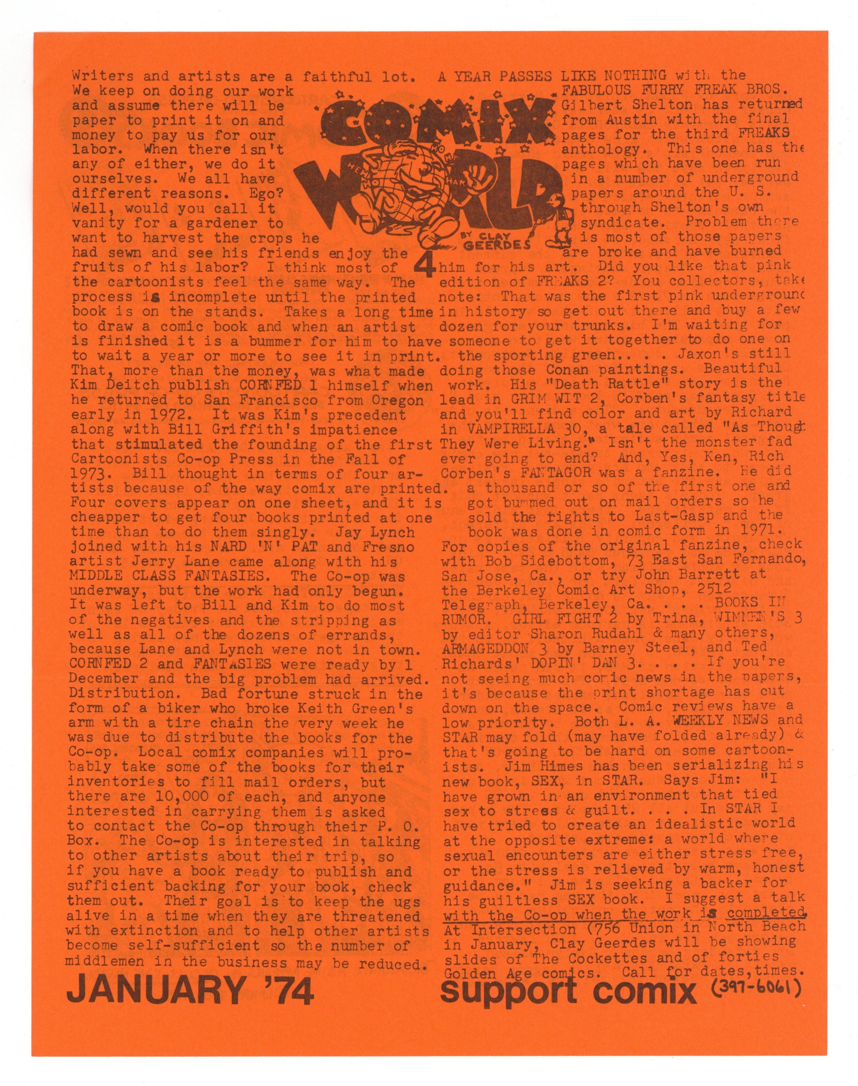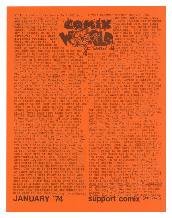 Tags: UndergroundPublished Jan 1974 by Clay Geerdes.$24.50January 1974. Newsletter by Clay Geerdes. Contains news of comix, artists of interest, and a general review of what was happening in the underground market. 8 1/2-in. x 11-in., 2 pages, black and white.