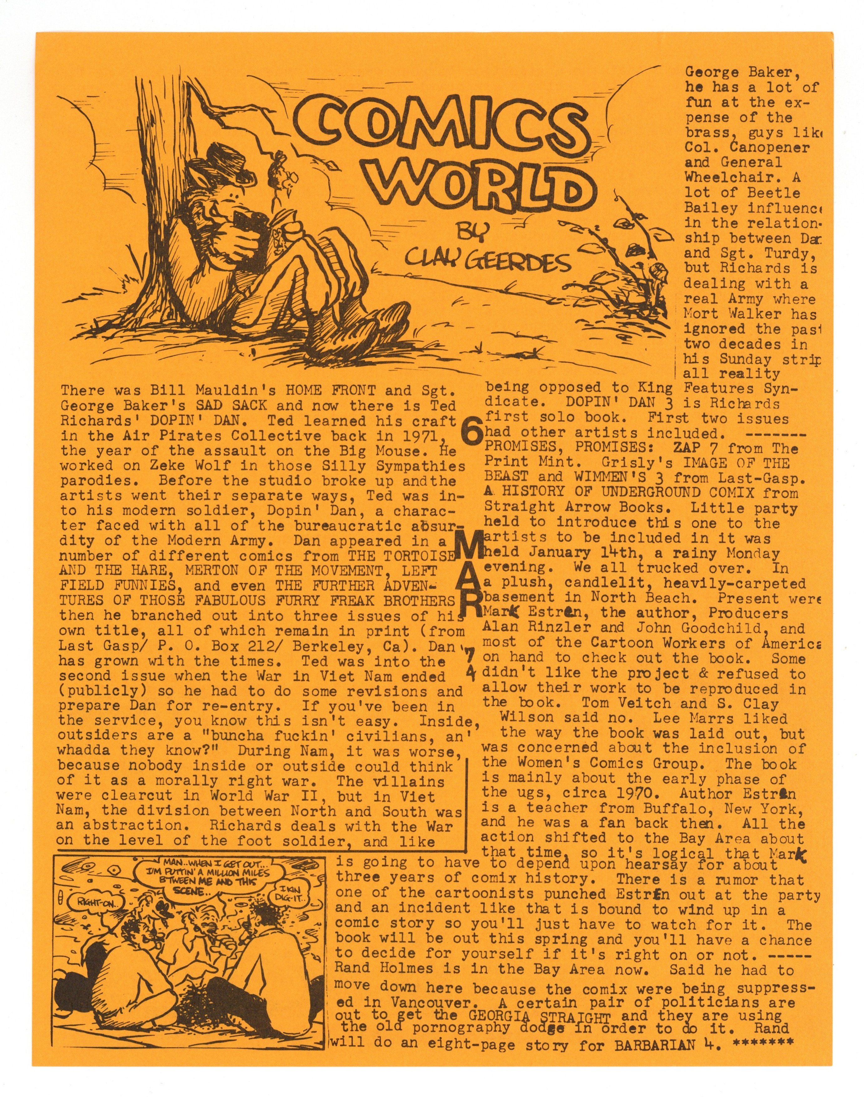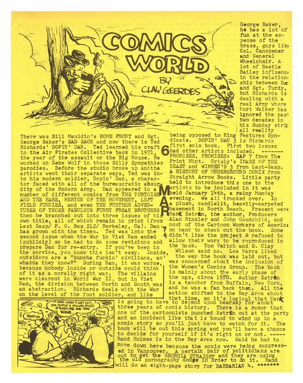March 1974. Newsletter by Clay Geerdes. Contains news of comix, artists of interest, and a general review of what was happening in the underground market. Ted Richards art. 8 1/2-in. x 11-in., 2 pages, black and white.