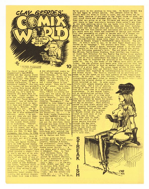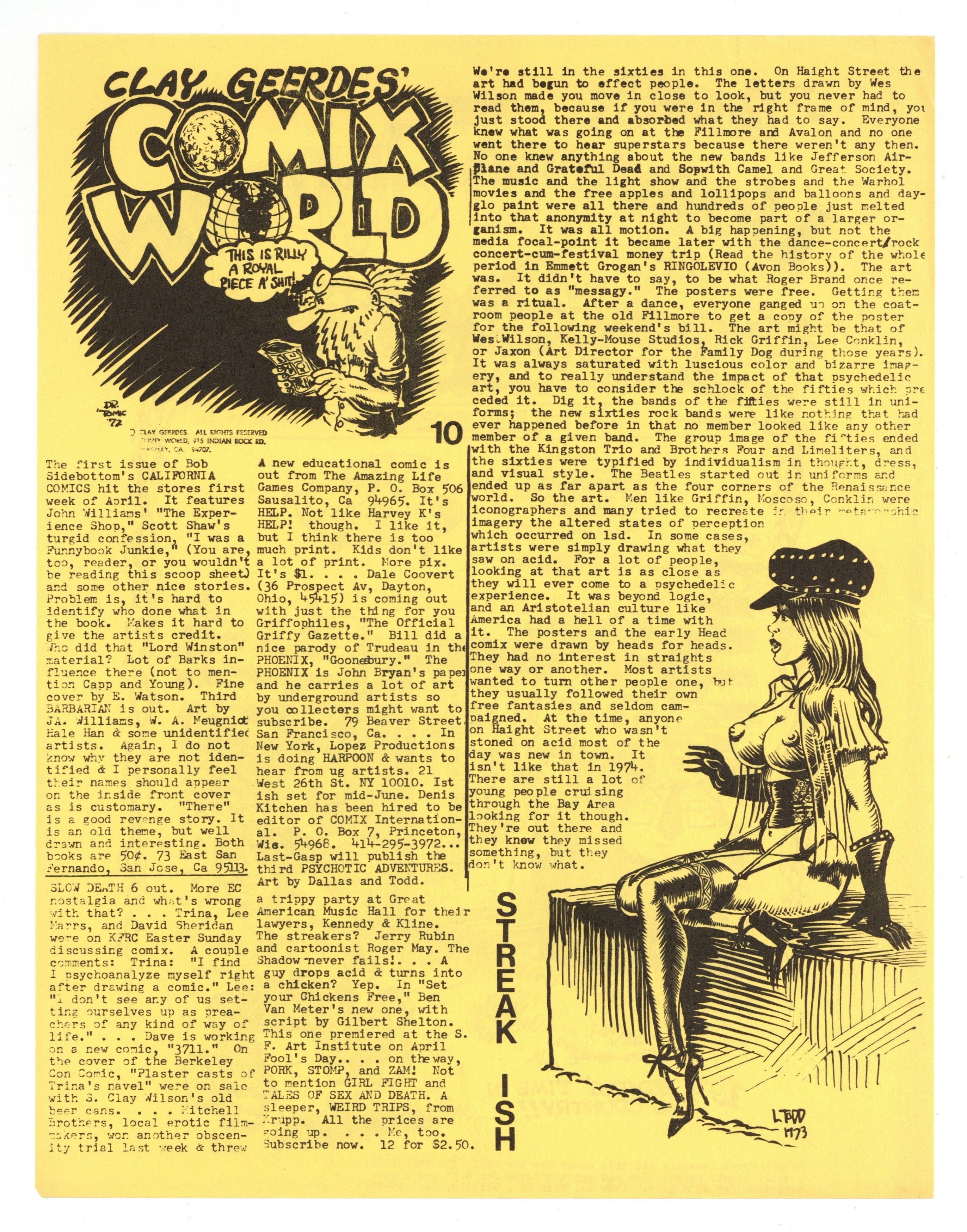 Published 1974 by Clay Geerdes.$17.501974. Newsletter by Clay Geerdes. Contains news of comix, artists of interest, and a general review of what was happening in the underground market. Larry Todd art. Full back-page ad for "The Mendocino Grapevine" with Robert Crumb art. 8 1/2-in. x 11-in., 2 pages, black and white.
