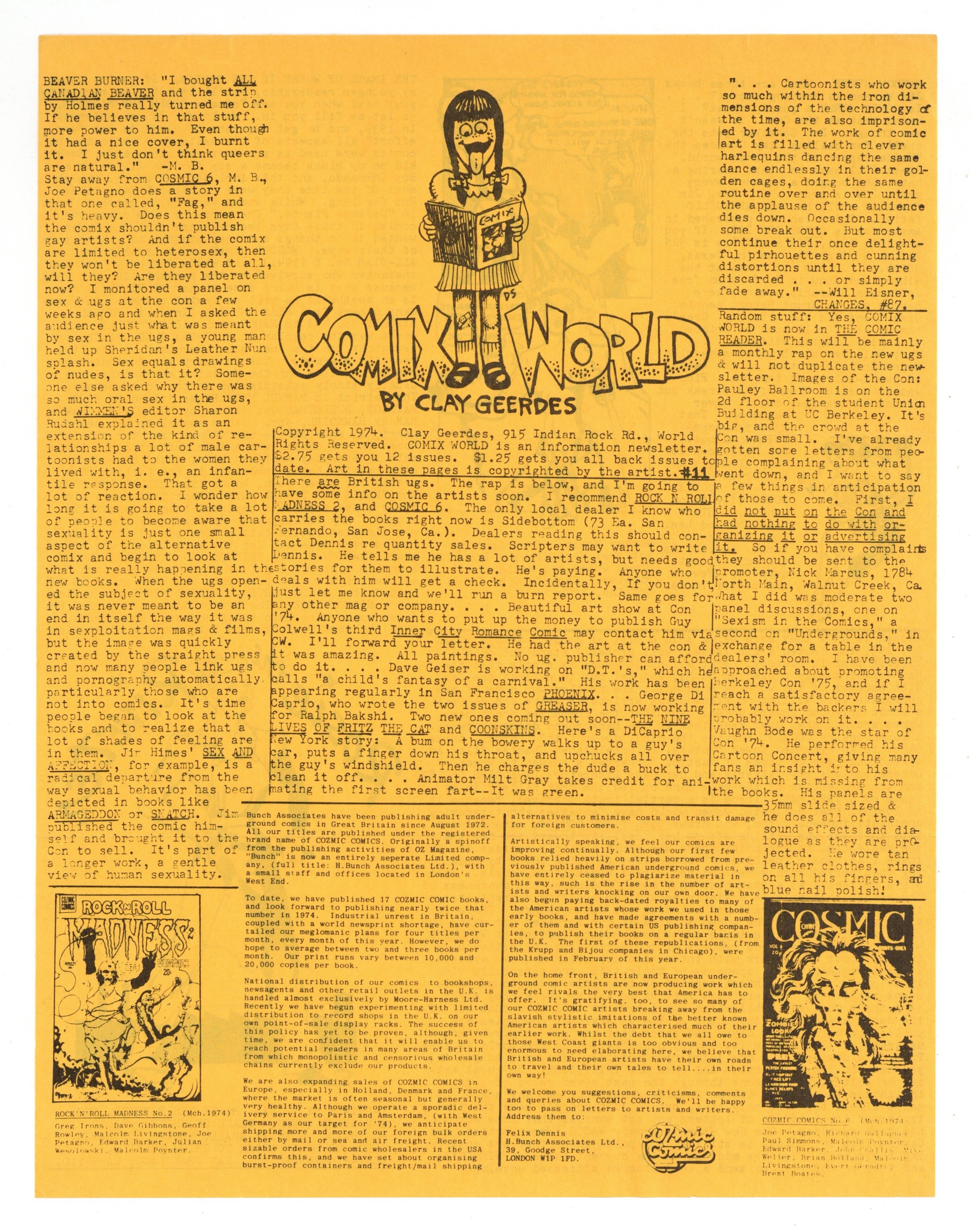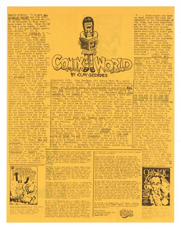 Tags: UndergroundPublished 1974 by Clay Geerdes.$24.501974. Newsletter by Clay Geerdes. Contains news of comix, artists of interest, and a general review of what was happening in the underground market. 8 1/2-in. x 11-in., 2 pages, black and white.