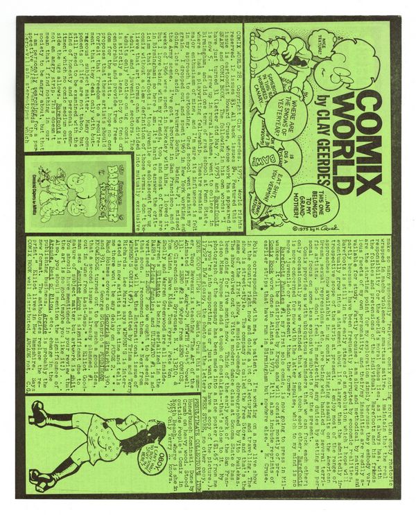 Published 1975 by Clay Geerdes.$17.501975. Newsletter by Clay Geerdes. Contains news of comix, artists of interest, and a general review of what was happening in the underground market. Howard Cruse art. 8 1/2-in. x 11-in., 2 pages, black and white.