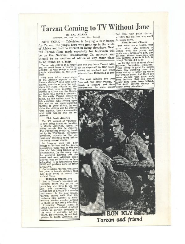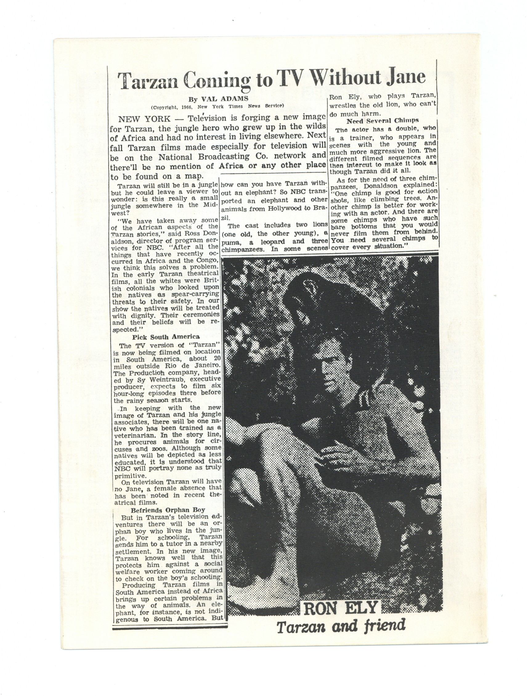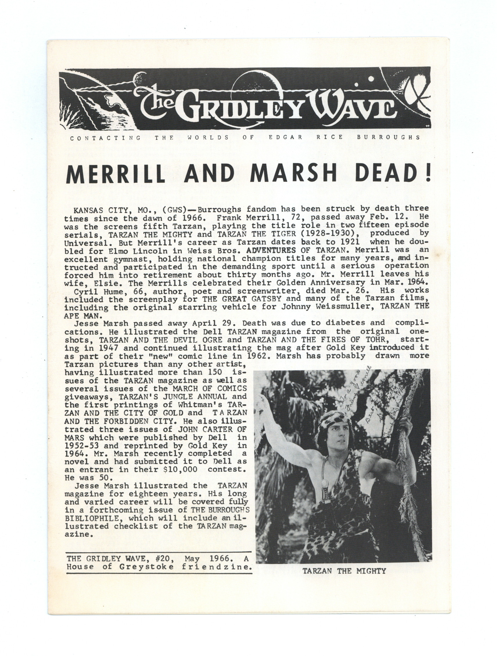Tarzan newsletter by Vernell Coriell. Frank Merill and Jesse Marsh dead, Dum-Dum '66 announcement, double page ad for Frank Frazetta's Master of Adventure with six illustrations, book review Tarzan and the Valley of Gold. 7-in. x 10-in., 8 Pages. B&W.