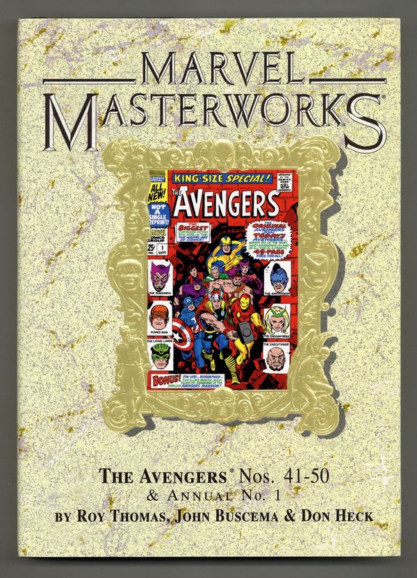 Volume 54 - 1st printing. "AVENGERS" Collects Avengers #41-50 and Annual #1. Written by ROY THOMAS. Art by JOHN BUSCEMA, DON HECK & GEORGE TUSKA. Cover by DON HECK. Introduction by Roy Thomas. The year was 1967, and what a year it was to be an Avengers fan. Why? Because Earth's Mightiest Heroes gained one of Earth's Mightiest artists-the one and only John Buscema! If an artist like Big John teaming up to create the titanic Thomas/Heck/Buscema triumvirate isn't enough to wet your whistle for amazing tales of the adventurous Avengers, then get a load of the manic Marvel Masterworks they have in store for you: Prince of Power, Hercules goes mano-a-mano with the Dragon Man; Captain America mixes it up with the Russian Red Guardian for the Red, White and Blue; the entire dag-blamed Avengers battle the Super-Adaptoid; Goliath and the Wasp face a blast from their shrinking past as they fight the Whirlwind. And a hero redeems the role of the Black Knight only to have the Avengers lose their teammates, Quicksilver and the Scarlet Witch, to Magneto and the Brotherhood of Evil Mutants-it's a cosmic balance, bub! And let us not forget, Avengers past and present joining together in combat against a sextet of baddies built up by the Mandarin. It's a story so huge it could only be contained in the first-ever Avengers Annual! Remember, True Believer, there's no guarantee that a yuletide gift this hot won't ignite, so don't forget to fireproof the ol' fir tree. Cover price $54.99.